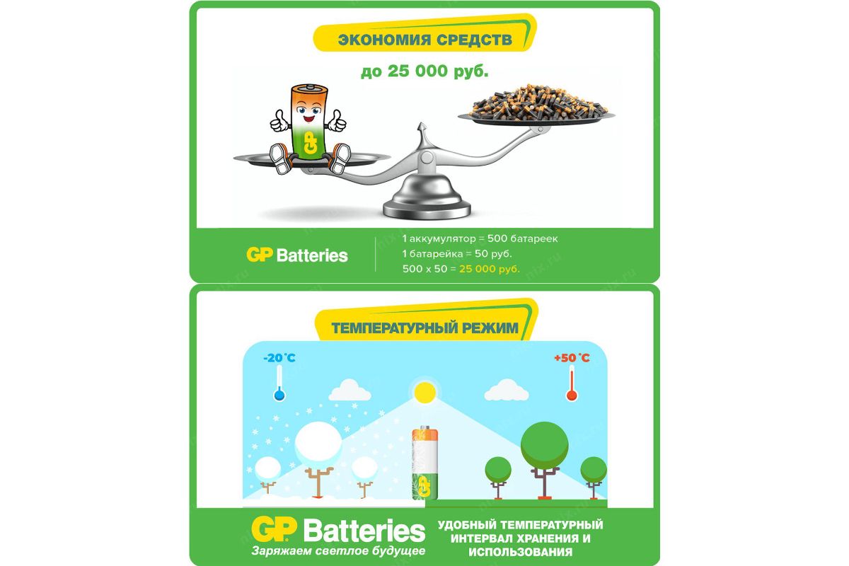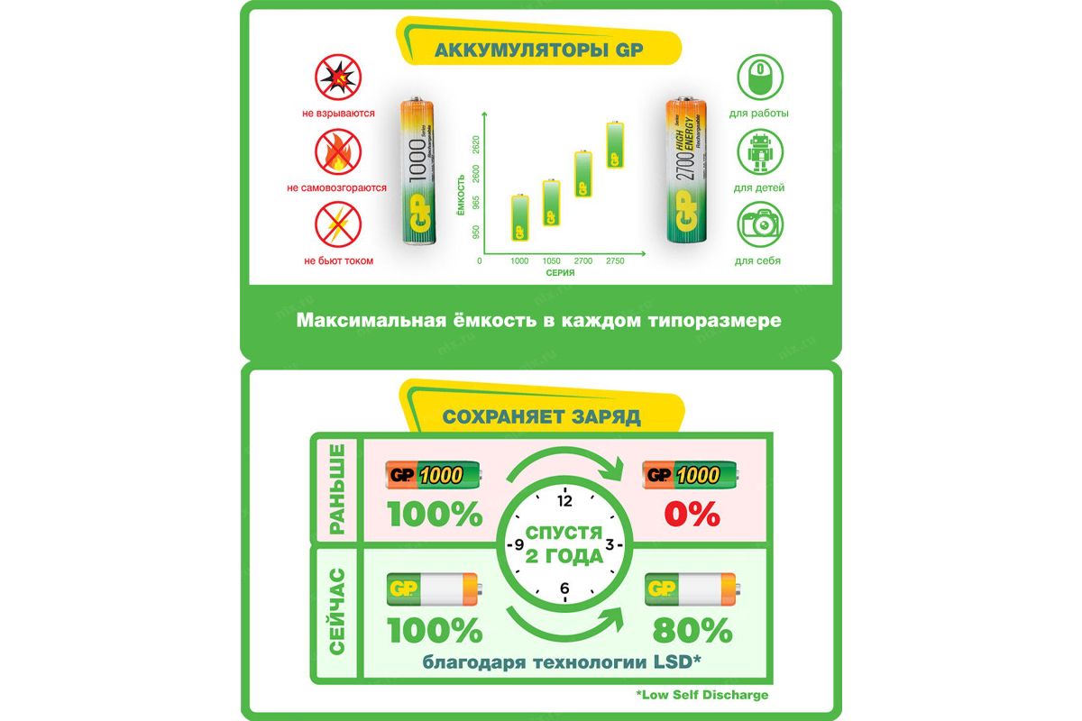 Емкость и плотность энергии никель-металлогидридных аккумуляторов GP типоразмера ААА (другие обозначения R03, 286, Micro) на 750 мАч более чем в два раза превышает уровень никель-кадмиевых аналогов. Поэтому они прекрасно подходят для работы в устройствах с высоким энергопотреблением, например, в фототехнике, в том числе фотовспышках, радиотелефонах, портативных аудиоустройствах, фонарях и светильниках, радиоуправляемых и других игрушках.