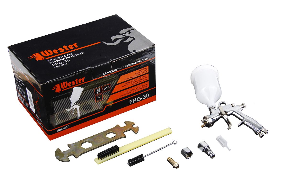 WESTER FPG-30 – профессиональный LVLP-краскопульт для покрытия поверхностей красками, лаками, грунтовкой и т.д. Отличается высоким процентом переносом материала на поверхность, с малой растратой на туманообразование.