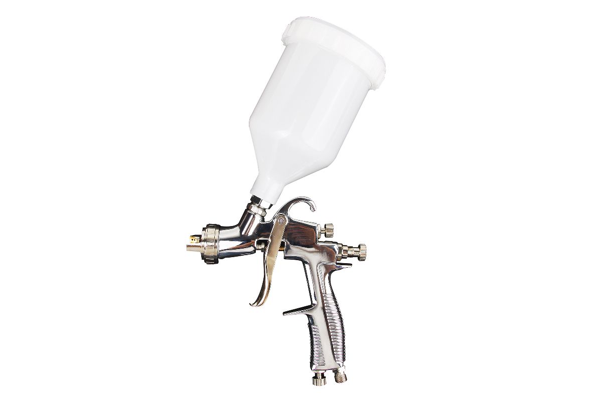 Краска распыляется по технологии низкого давления на воздушной головке. На поверхность переносится 65% краски.