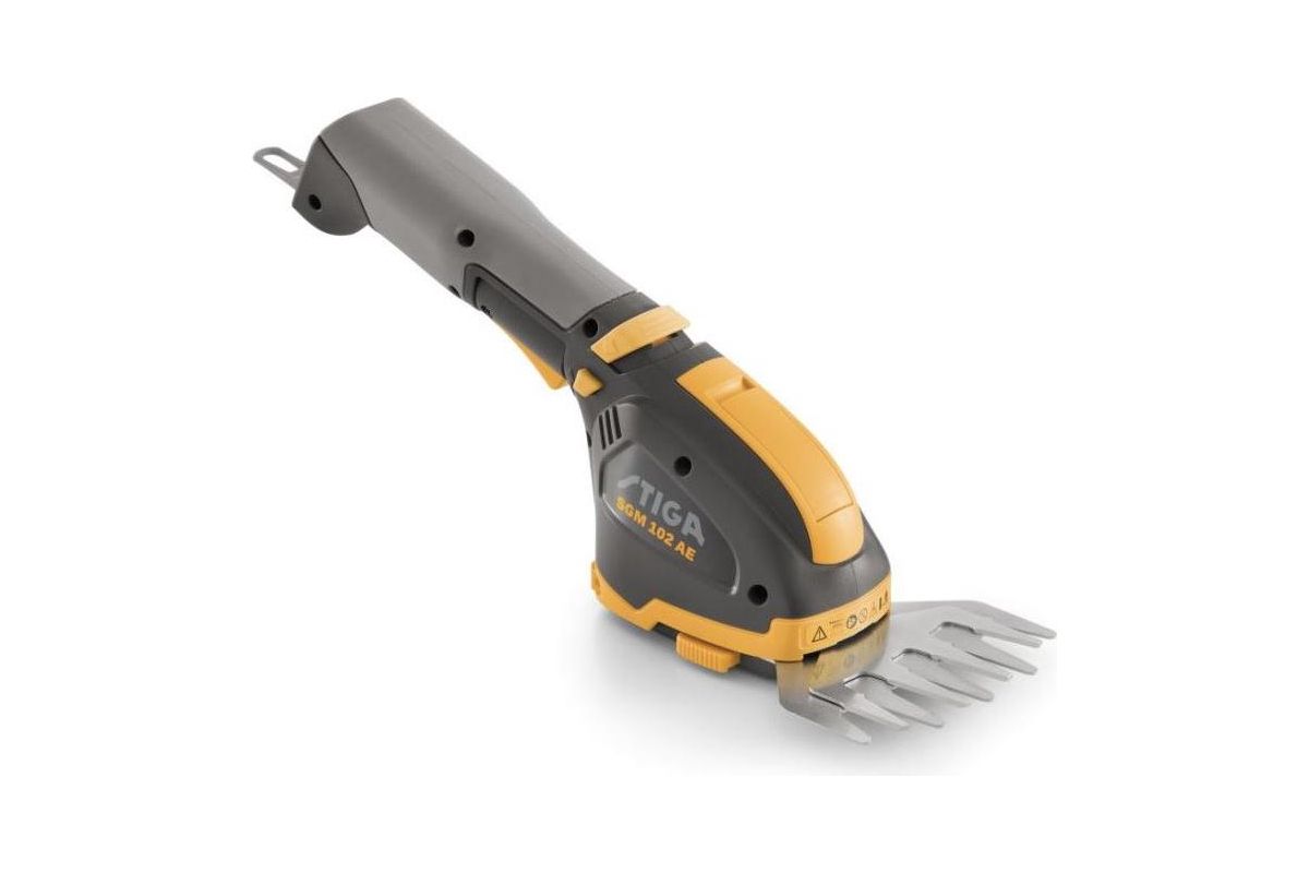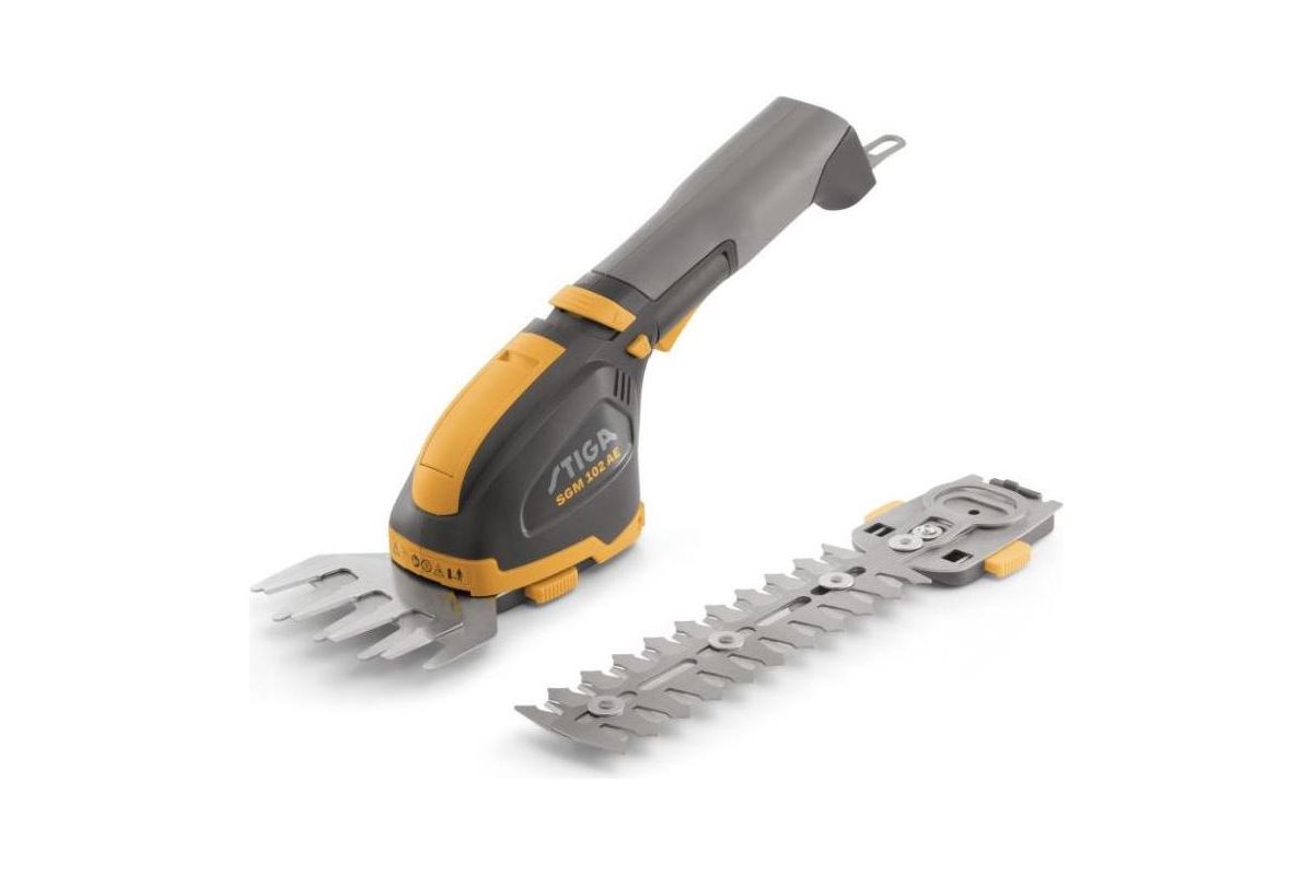 STIGA SGM 102 AE – аккумуляторные ножницы. Питаются от литий-ионного аккумулятора 10,8 В. Аккумулятор в комплекте. Максимальная толщина реза 8 мм. Вес 0,66 кг. Подойдут для придания формы живой изгороди и подрезания кромок газонов.