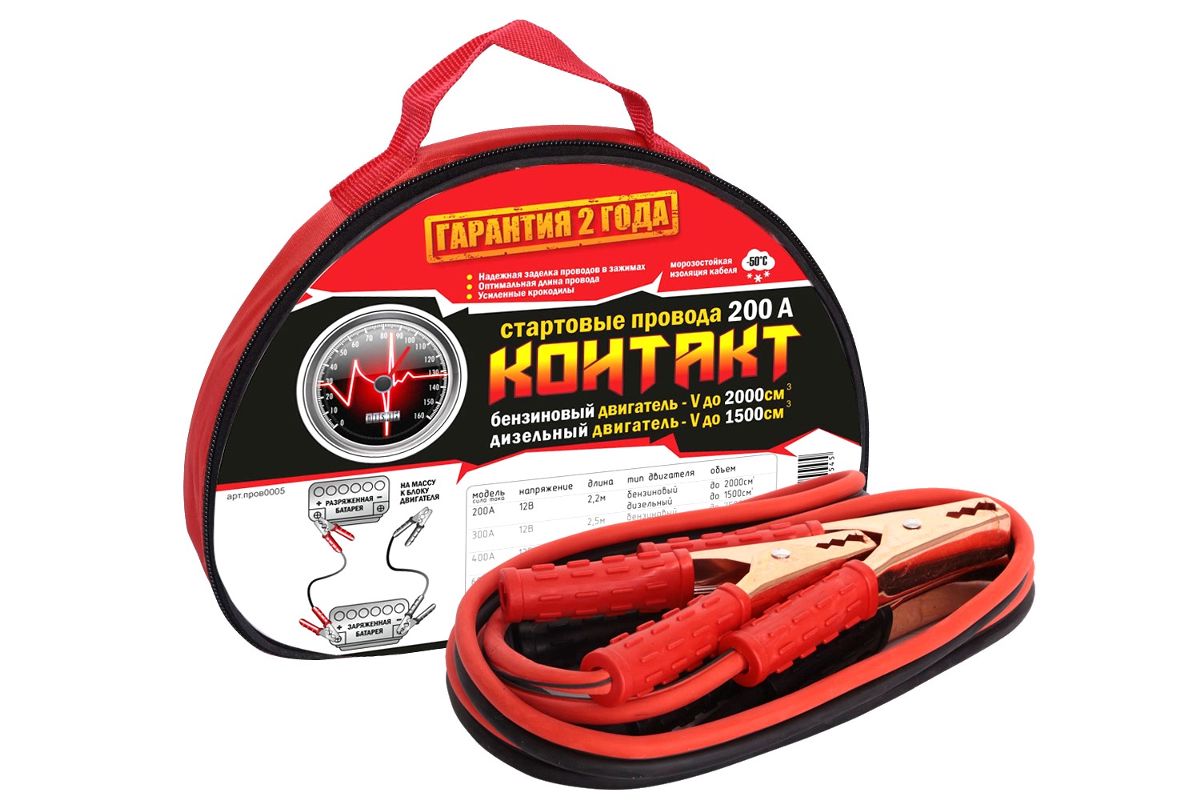 Провода прикуривания ''Контакт'' рассчитаны на силу тока до 200 Ампер. Длина 2,2 метра. Специальная окраска проводов обеспечивает однозначное подключение к аккумуляторам и защищает от переполюсовки.
