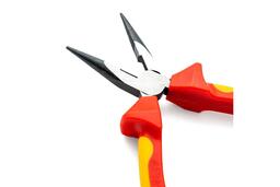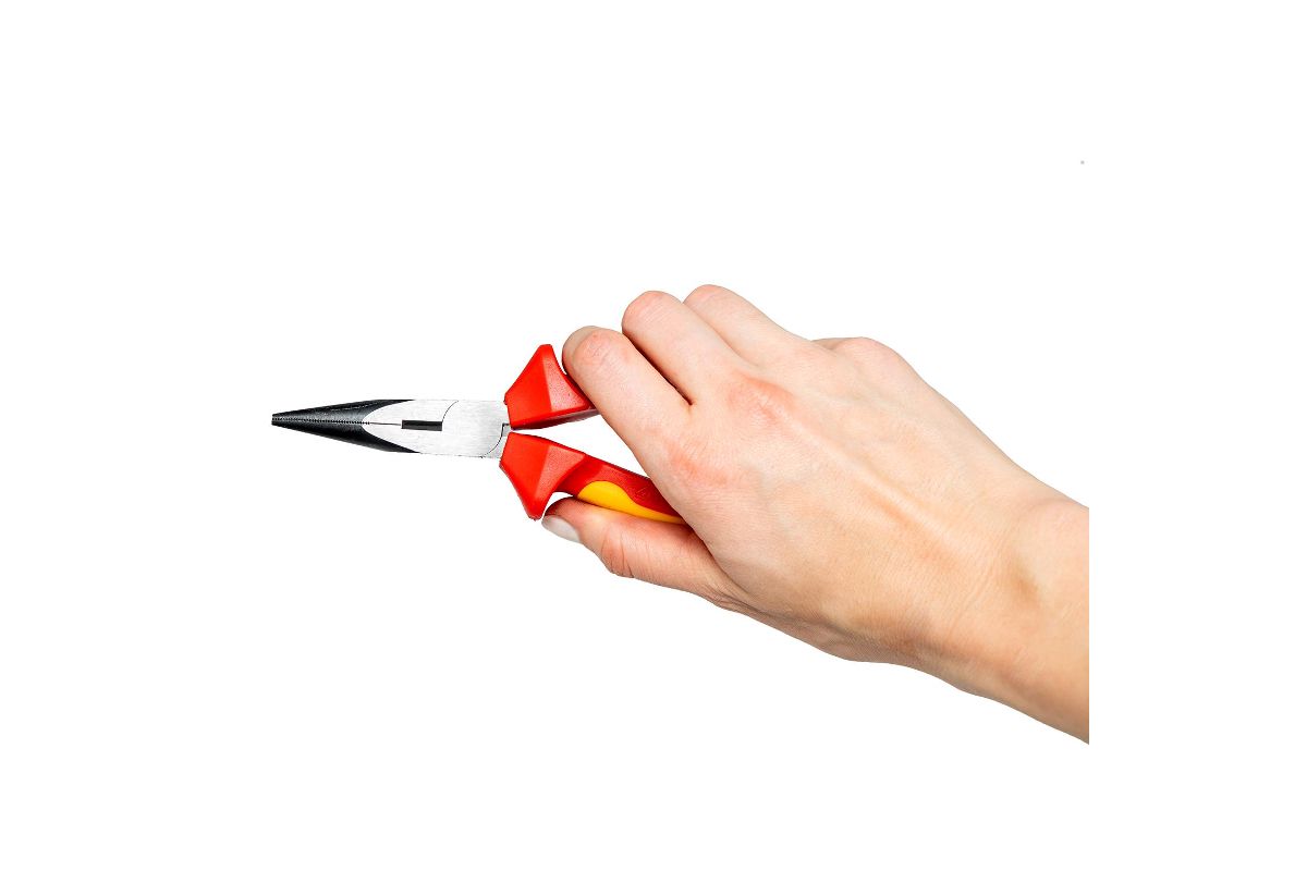 Специализированный электромонтажный инструмент. Длинногубцы предназначены для манипуляций с деталями под напряжением до 1000В, благодаря специальному металлу и диэлектрическому покрытию рукояток TPE. Удобен для работы с проводами и проволокой, мелкими частями. Инструмент сертифицирован немецкими стандартами качества VDE и GS. Знак VDE (Verband Deutscher Elektrotechniker) – является документальным подтверждением безопасности электроинструмента. Материал рабочей части – хром–никелированная сталь марки 55, с двухсторонней полировкой и 2–этапным процессом электрофорезификации.