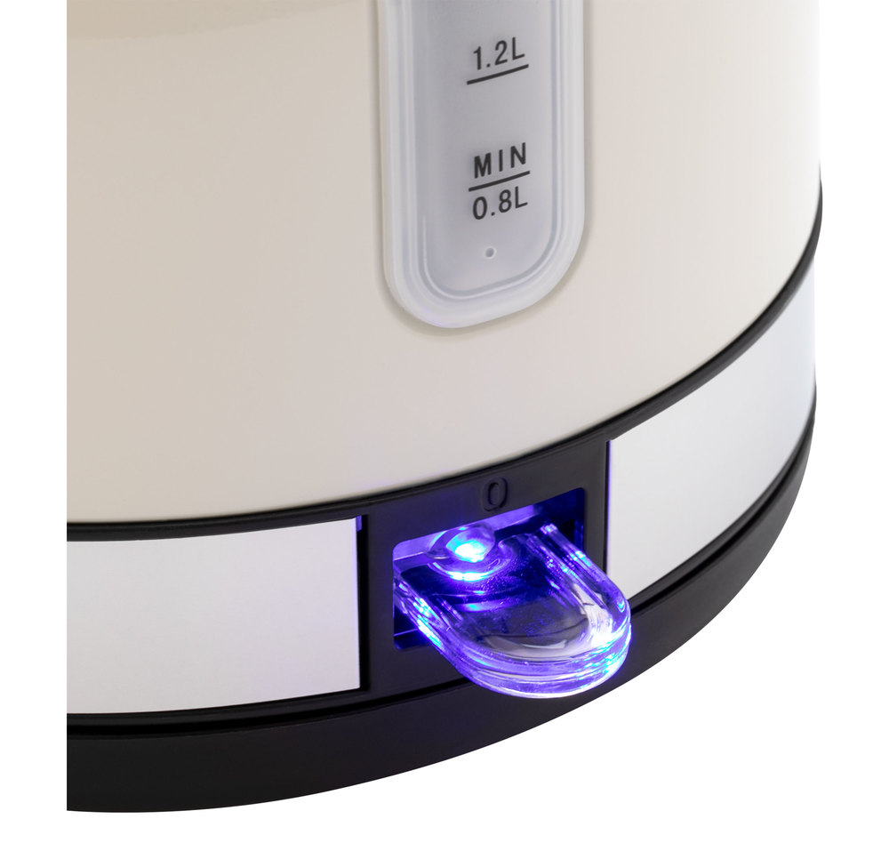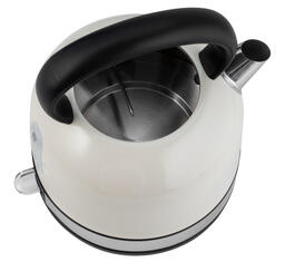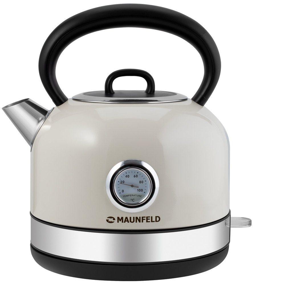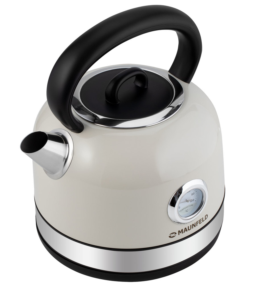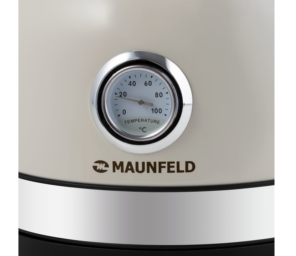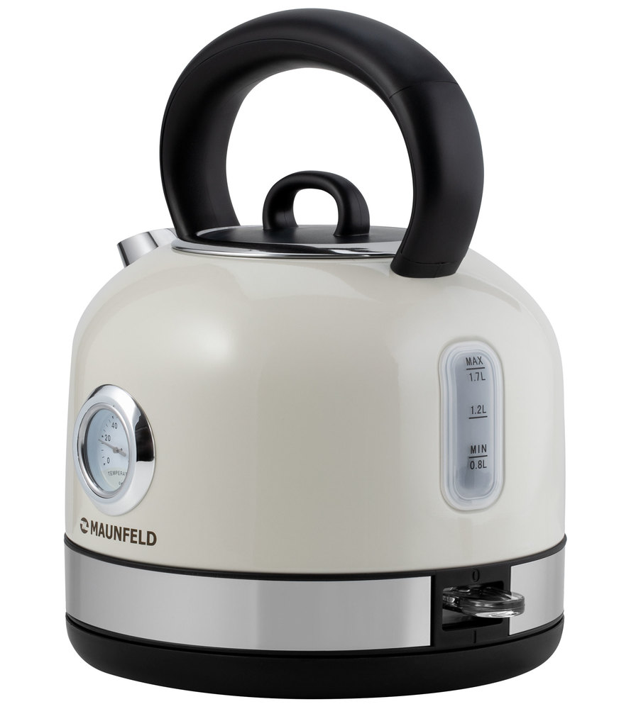 Уникальное сочетание внешнего вида классического чайника с функциональностью электрического. Основательный корпус бежевого цвета, крышка с ручкой и металлической окантовкой, короткий носик чайника, круглый винтажный термометр и верхнее расположение ручки, – все это привносит дух английского чаепития. Индикатор уровня воды находится сбоку на корпусе, над кнопкой включения с синей подсветкой. Ручное открывание крышки позволяет не только с легкостью наливать некипяченую воду в чайник из фильтра, но и значительно облегчает мытье самого чайника. В носике круглого сечения крепится съемный фильтр, который легко достается и моется. Для безопасного использования предусмотрено автоматическое и ручное отключение чайника.