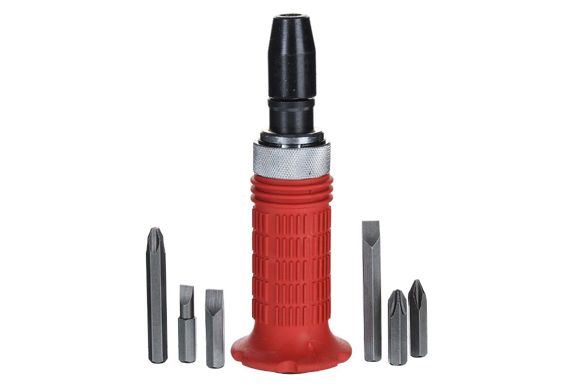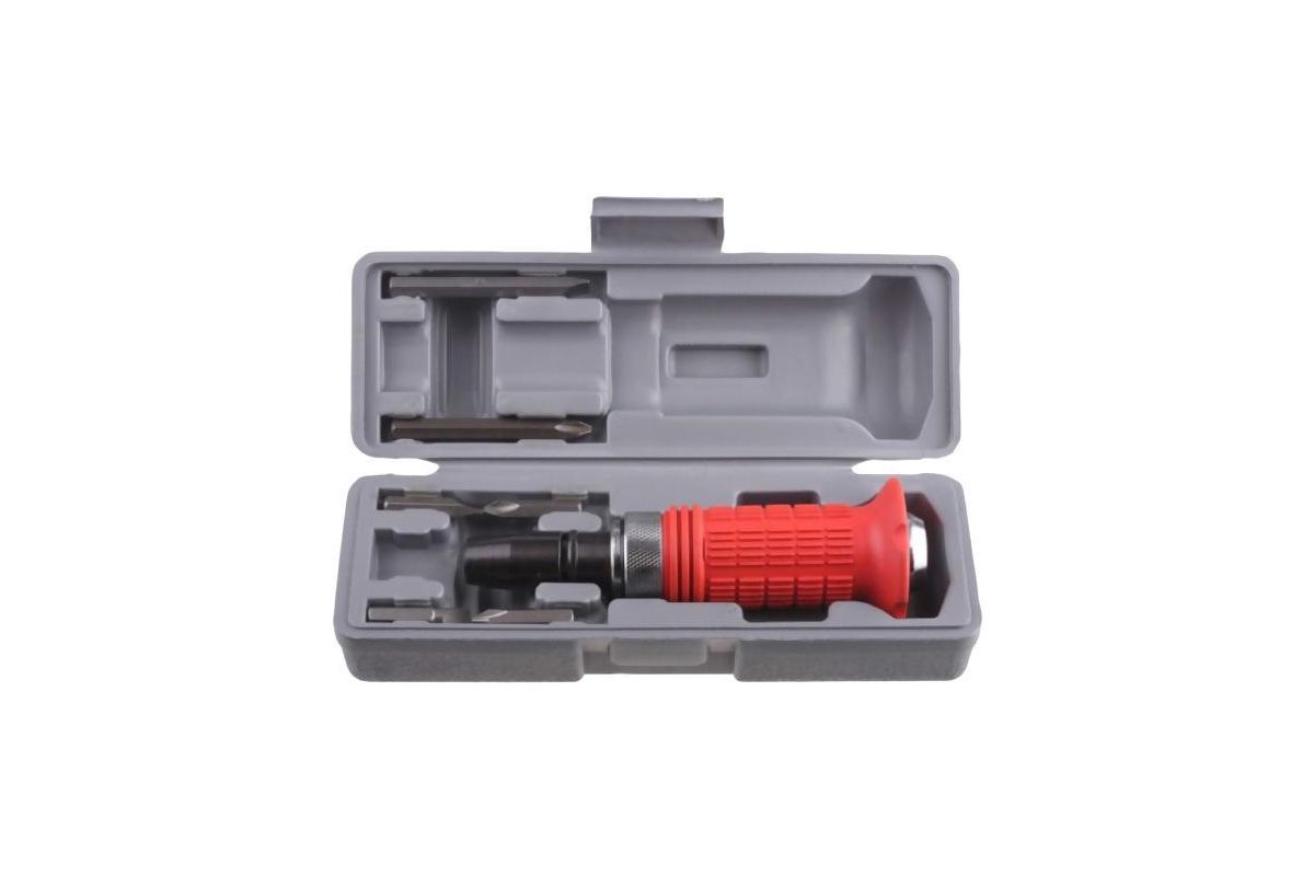 Отвертка имеет обрезиненную рукоятку с протектором, оснащена ударными битами SL и РН.