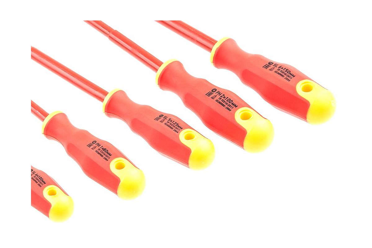 Набор диэлектрических отверток до 1000В СИБРТЕХ 7шт 12936 обладает диэлектрическим покрытием стержня, что позволяет использовать инструмент с крепежными соединениями, находящимися под напряжением до 1000 В.