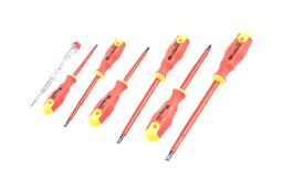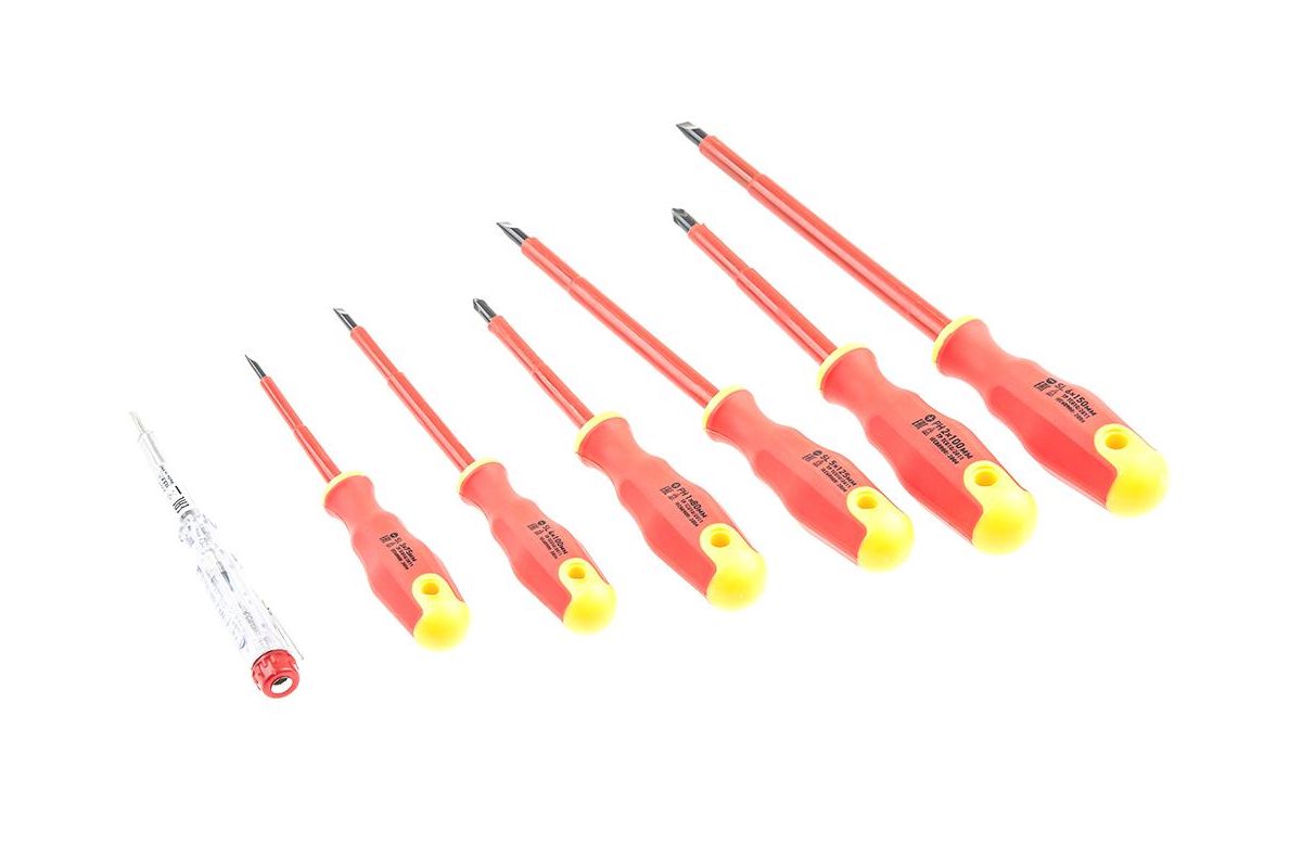 В комплекте поставляются отвертки с прямым и крестовым шлицами, а также индикаторная отвертка для определения напряжения в сети.