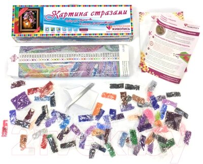 - Комплектация набора инструкция, пинцет, лоток для страз, набор страз, полотно-схема с клеевой основой