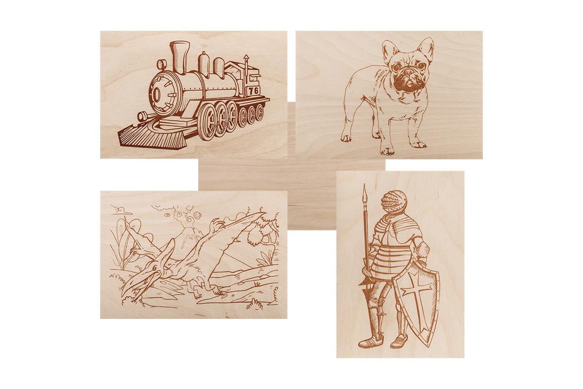 Состав набора № 3: 5 досок для выжигания (4 доски с нанесенными картинками в различной тематике (воин, динозавр, собака, машина) и 1 доска для самостоятельного творчества (без эскиза рисунка).