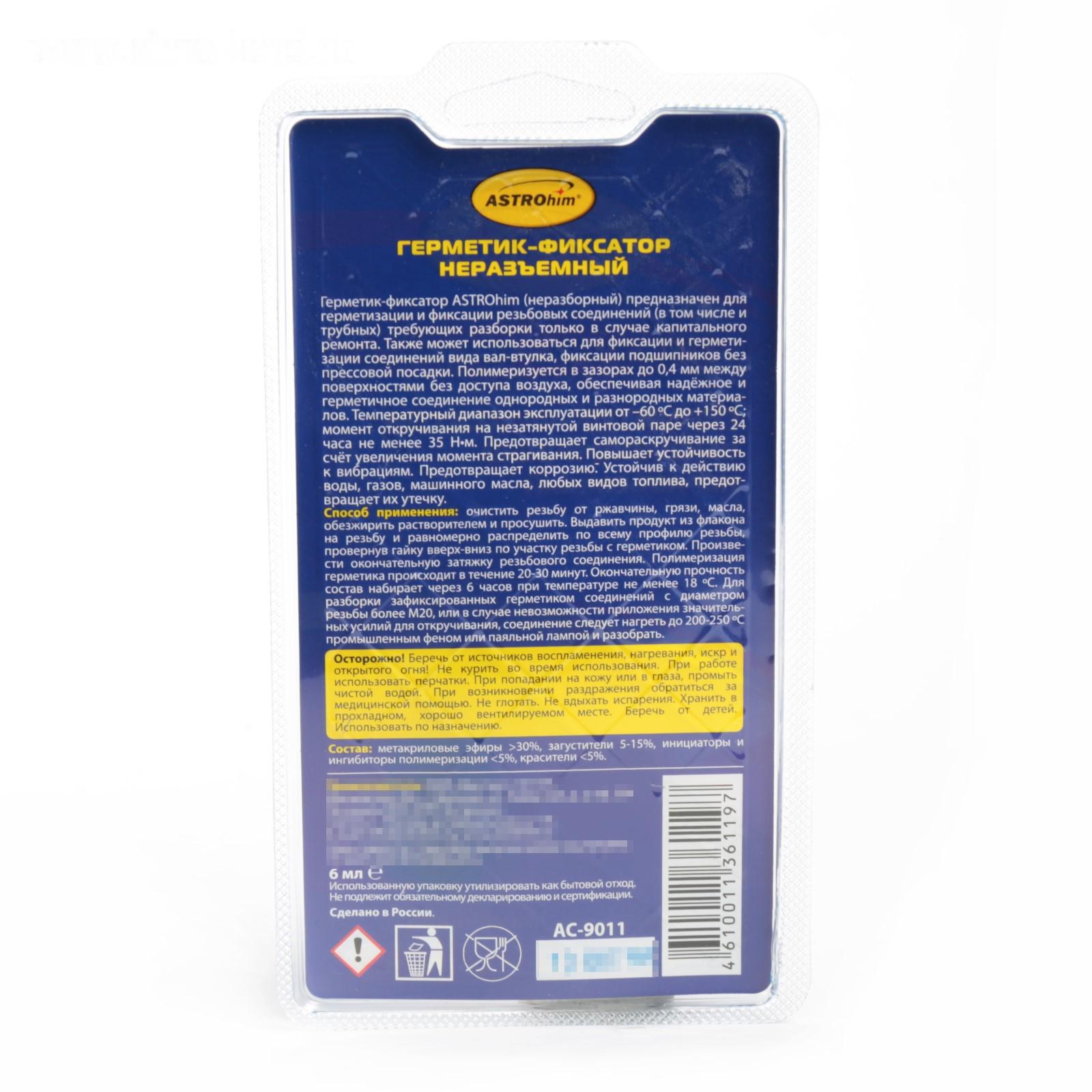 Фиксатор резьбы Astrohim высокопрочный, неразъемный, 6 мл, АС - 9011