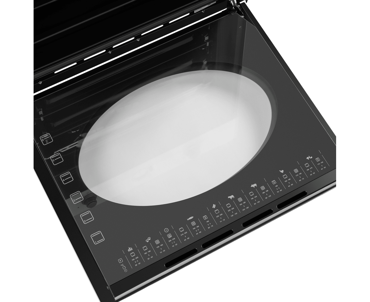 Тангенциальное охлаждение, реализованное в данной модели, минимизирует передачу тепла от духовки предметам, находящимся рядом, например мебели. Дверца состоит из 3-х стекол, что создает холодный фронт и делает процесс приготовления безопасным, так как внешнее стекло практически не нагревается.