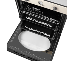 Механическое управление с помощью поворотных ручек интуитивно понятно и позволяет выбрать режим работы, температуру готовки (50°-250°C) и включить таймер (до 120 мин). В данной модели установлен стильный таймер с классическим циферблатом. В данной модели есть 10 режимов: традиционный нагрев, большой гриль, конвекционный нагрев, малый гриль, разморозка, конвекция с нижним нагревом, горячий воздух, пицца, объемный турбогриль, освещение.