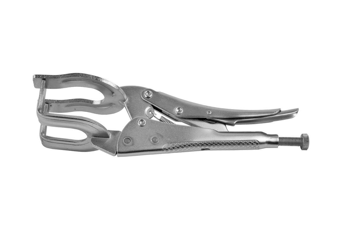 Зажим применяется для фиксации и удержания заготовок для удобного проведения слесарно-монтажных, сварочных или ремонтных работ. Может быть использован в качестве разводного или трубного ключа. Благодаря усиленной кованой конструкции и системе коленчатых рычагов, обеспечивается надежная фиксация заготовки и высокое давление опрессовки.