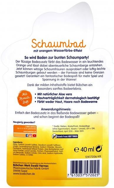 Рідка домішка для ванн із приємним ароматом забарвлює воду у ванні в оранжевий колір та створює гори м'якої піни. Тепер ви можете спробувати гарні пінні зачіски або побудувати легкі повітряні замки з піни — немає межі вашої фантазії. Гарантоване фантастичне задоволення від купання у ванній кімнаті.
