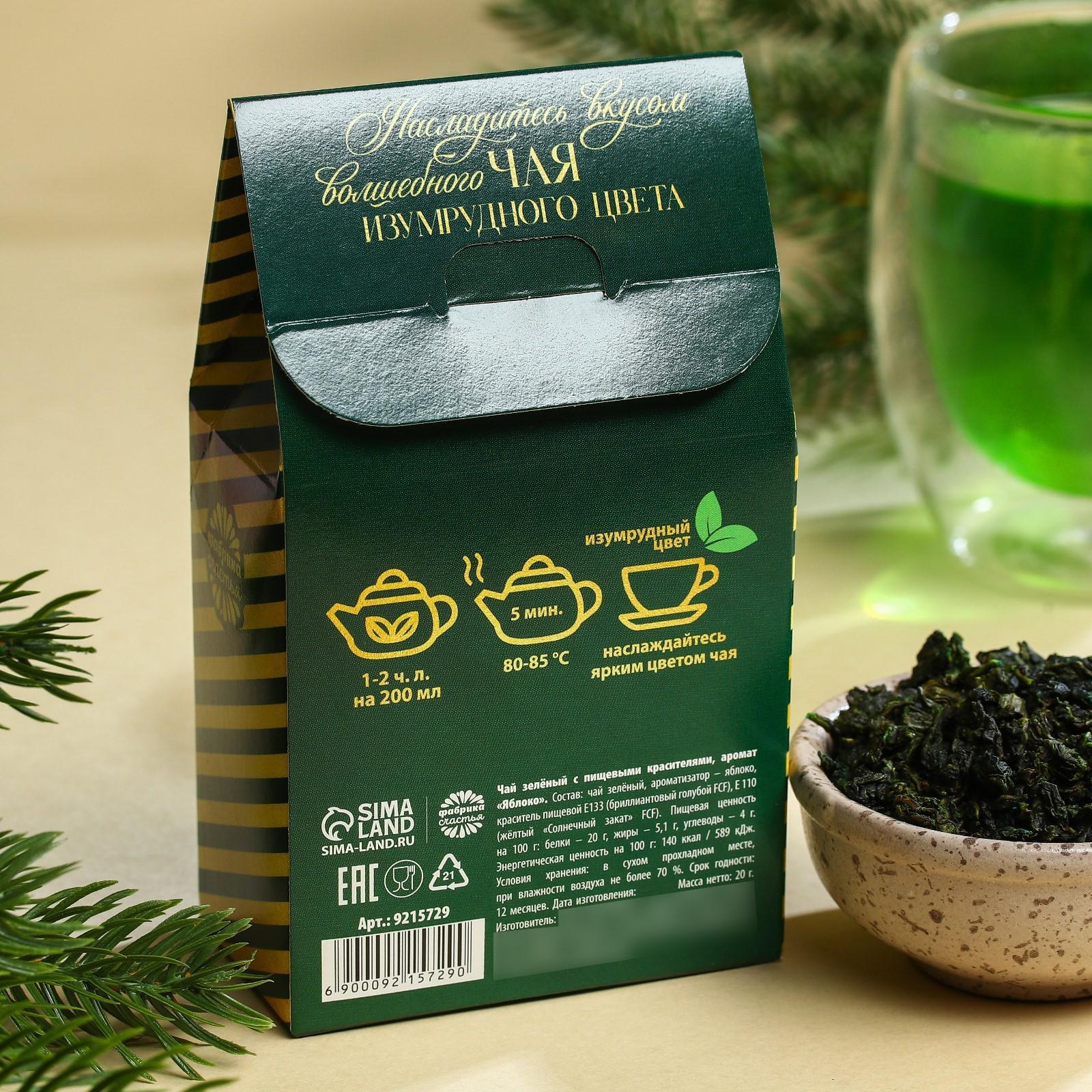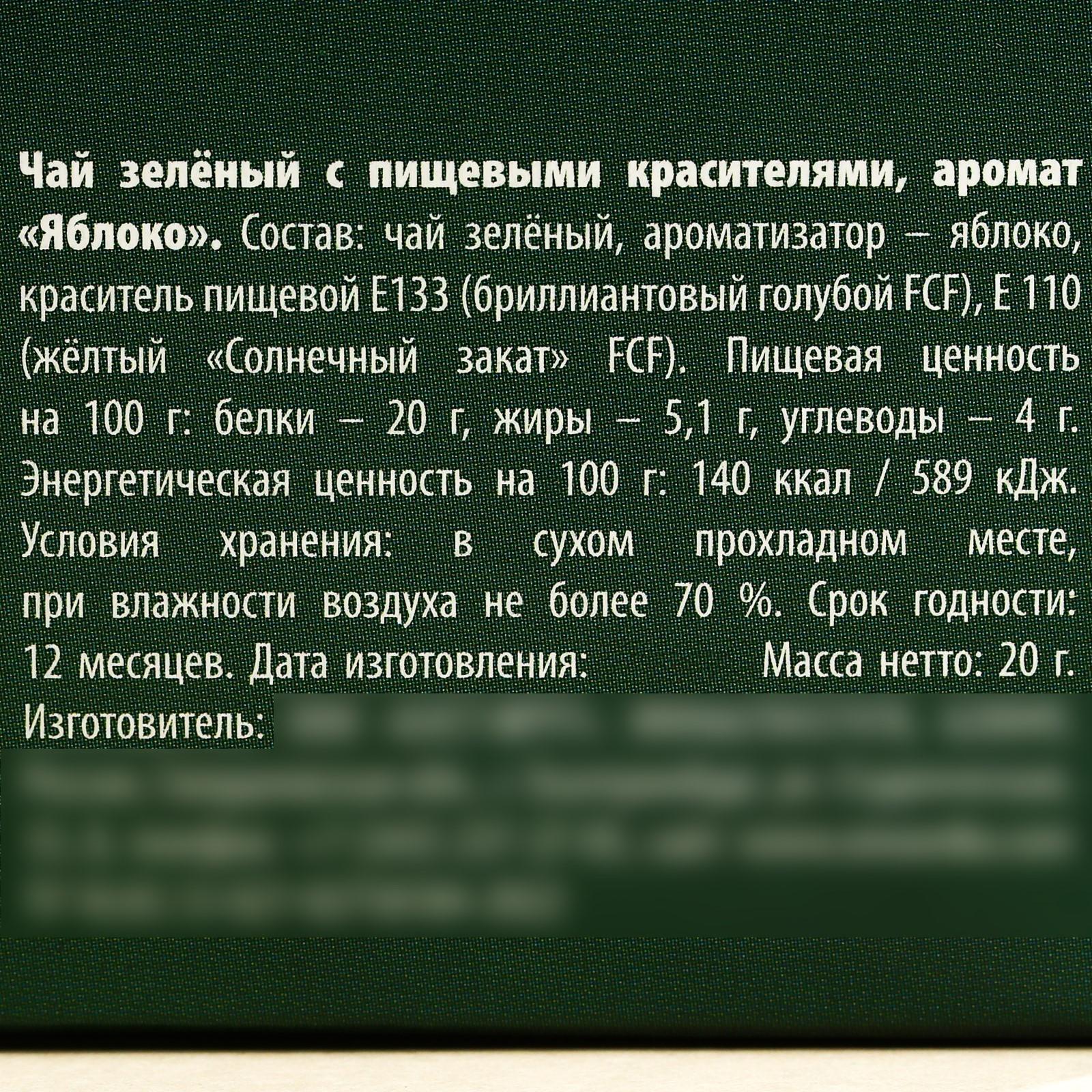 Состав: чай зелёный, ароматизатор – яблоко, краситель пищевой Е133 (бриллиантовый голубой FCF), Е 110 (жёлтый «Солнечный закат» FCF).