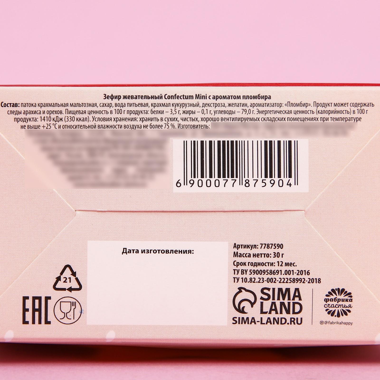 Состав: патока крахмальная мальтозная, сахар, вода питьевая, крахмал кукурузный, декстроза, желатин, ароматизатор: «Пломбир».