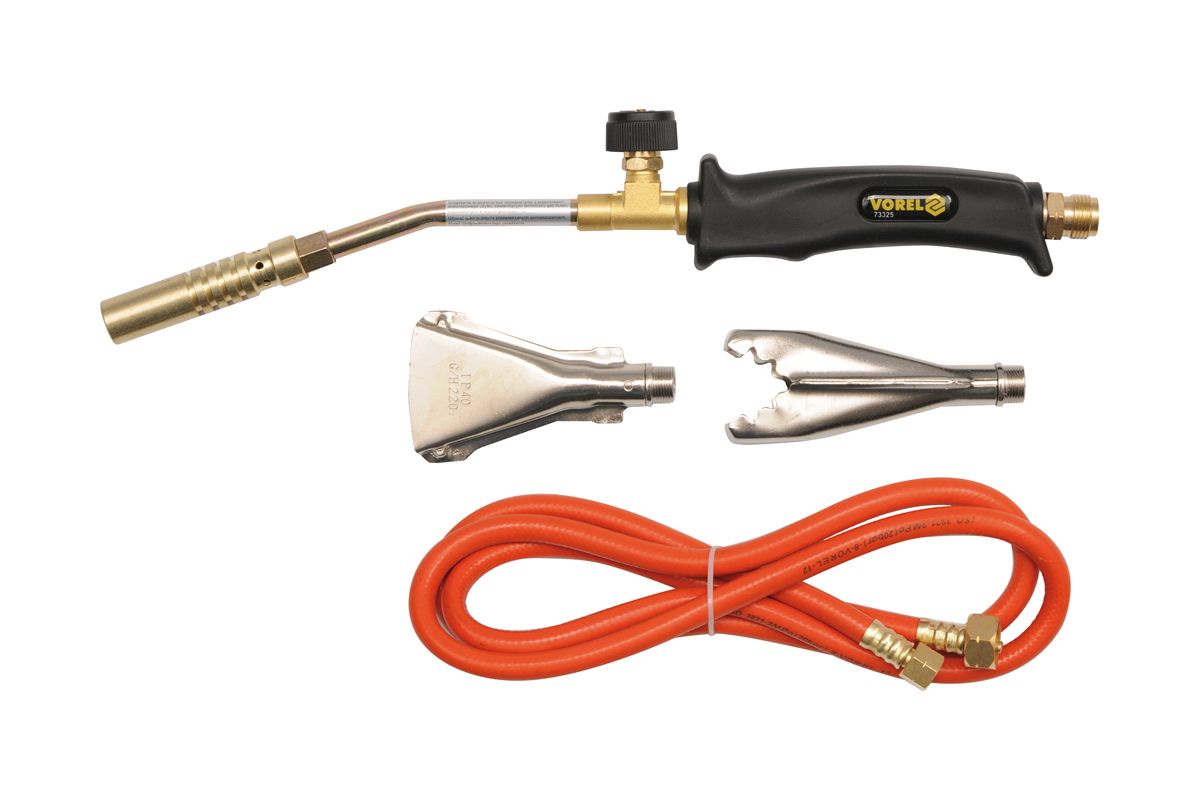 Горелка с гибким шлангом и сменным картриджем VOREL. 3 чаши горелки: 17, 22, 40 мм; номинальное давление подачи газа - 0,5 Мпа, температура пламени - 800-1200 С, номинальный поток - 140 г/ч, нагрузка - 2 кВт, длина шланга - 2 м, длина горелки (без шланга) - 360 мм. Набор газовых горелок предназначен для сантехнических работ и многих применений в других отраслях. В состав набора входит универсальный держатель, специальный шланг 2м с разъемами для газового баллона и горелки, а также сопла, формирующие пламя. Мы можем использовать сопла балльной 17мм, сопло 22 с пламенем или плоского сопла 40 мм для нагрева и солнечных ванн.