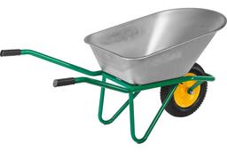 Прочный стальной кузов толщиной 0,9 мм и объемом 90 л для сыпучих грузов имеет цинковое покрытие, обеспечивающее защиту тачки от внешних воздействий.