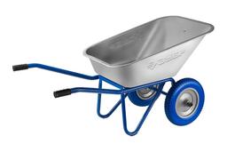 Прочный стальной кузов толщиной 0,9 мм и объемом 110 л для сыпучих грузов имеет цинковое покрытие, обеспечивающее защиту тачки от внешних воздействий.