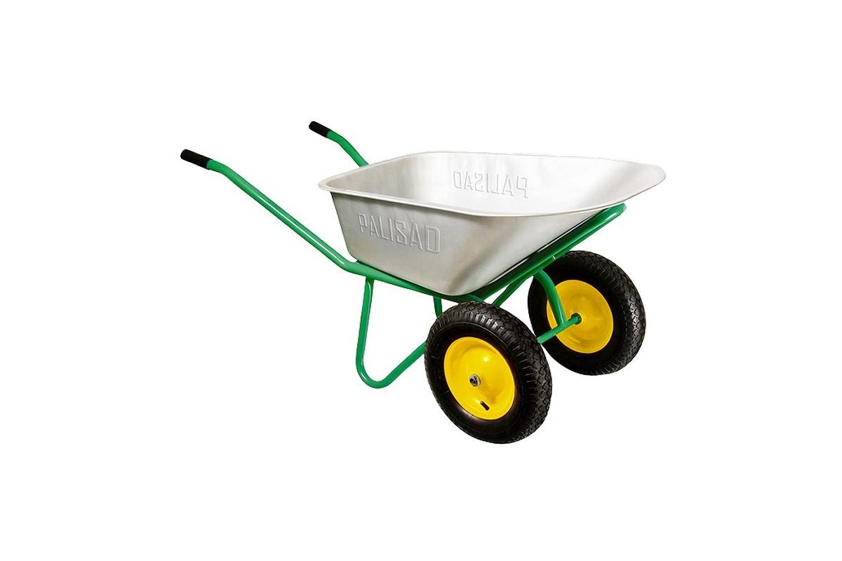 Нагрузка в данной тачке распределяется на два колеса, поэтому она более устойчива и сбалансирована, оказывает меньшее давление на грунт, и с ее помощью легче перевозить грузы. Максимальная нагрузка на руки составляет 10–15 % от веса перевозимого груза. Ниппели колес автомобильные, диски сварные.