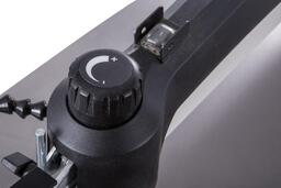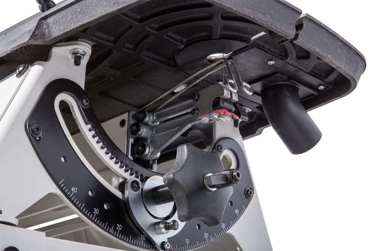 Чугунный стол жестко закреплен на основании и обеспечивает точную работу без вибраций. Для выполнения распилов под углом к поверхности наклоняют «раму» с натянутым пильным полотном. Заготовка всегда остается в горизонтальной плоскости. Регулировка наклона производится зубчатым механизмом с приводом от вращающейся рукоятки. Он симметричен и обеспечивает поворот как влево, так и вправо.
