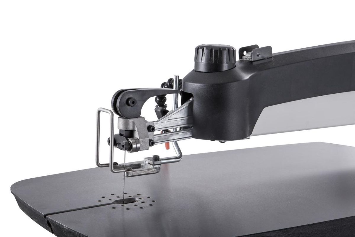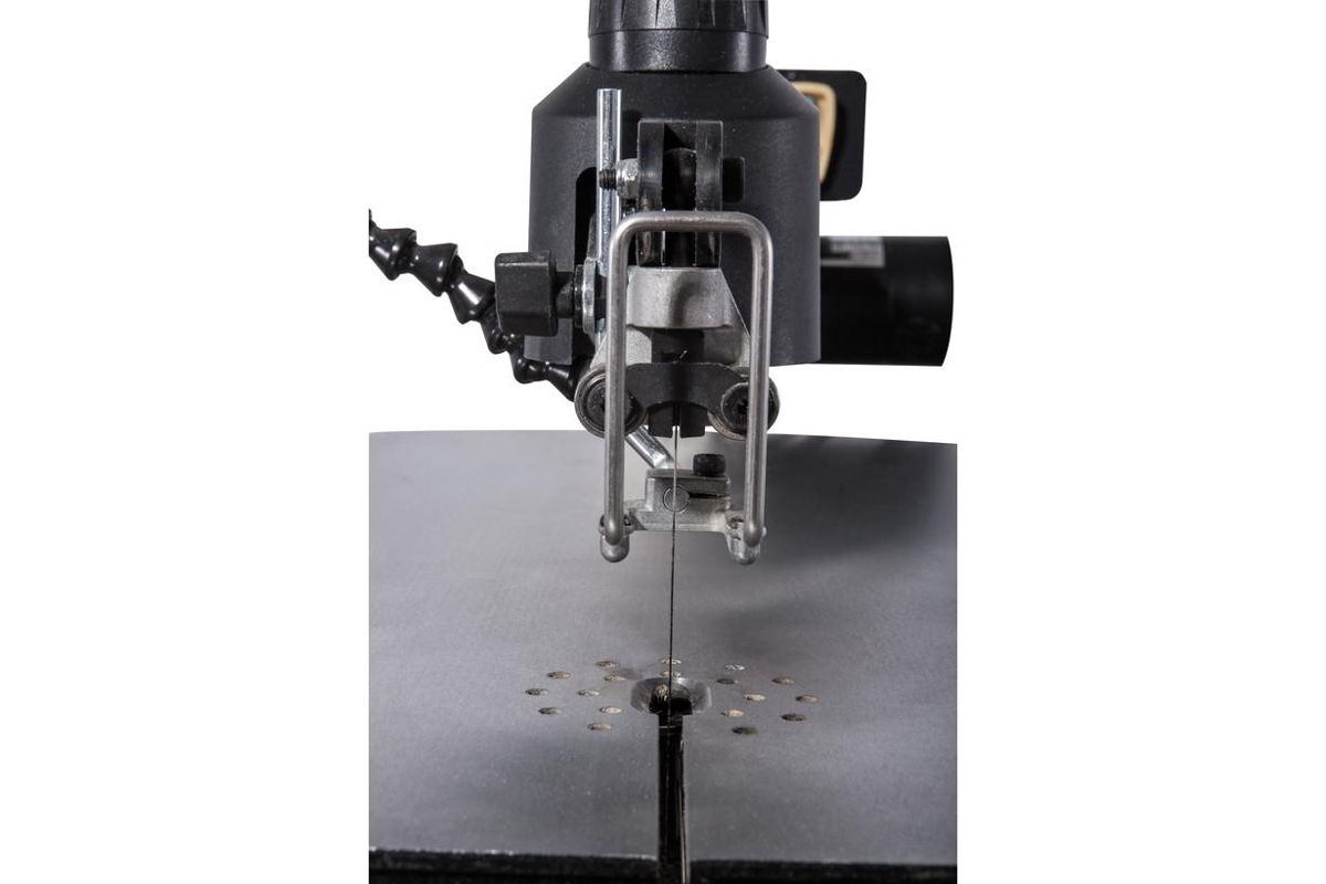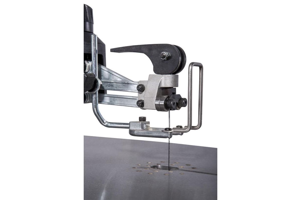 Станок работает с пильными полотнами без штифта. Верхняя часть пилки зажимается эксцентриковым механизмом, совмещенным с натяжителем, нижняя предварительно зажимается в адаптер, а после вставляется в вилку-оправку. В комплекте два таких адаптера, что позволяет иметь в быстром доступе полотна разных типов. Благодаря наличию прорези в рабочем столе существенно упрощается установка на стол заготовок с продетой пилкой.