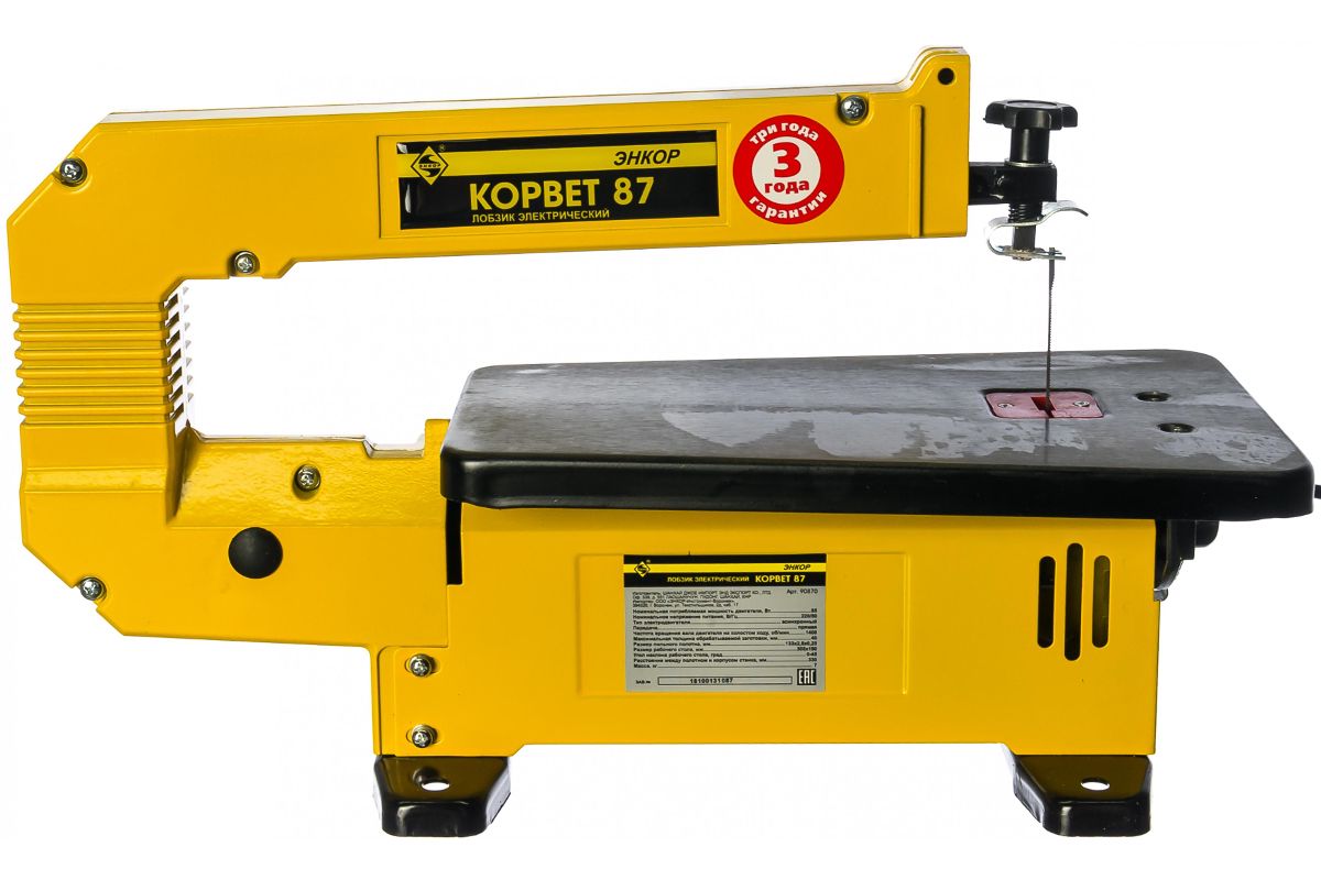 ЭНКОР Корвет-87 – лобзиковый станок для выпиливания фигур различной сложности из небольших деревянных заготовок, используется для прямых резов и наклонных пропилов. Укомплектован надежным асинхронным двигателем, имеет систему регулировок для выполнения разнообразных работ.