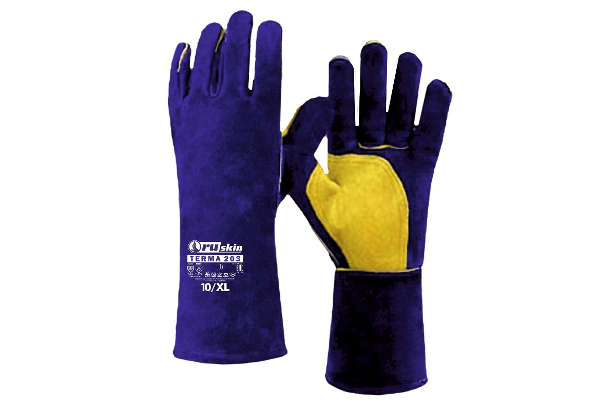 Защитные перчатки RUSKIN Terma 203 надежно оберегают руки сварщика от тепловых и механических повреждений. Основным материалом служит спилковый слой натуральной кожи толщиной 1,2 мм. Перчатка длиной 350 мм защищает не только кисти. Широкая крага прикрывает предплечья и позволяет заправить манжеты спецодежды. Изделие 10 размера, вес 90 г.