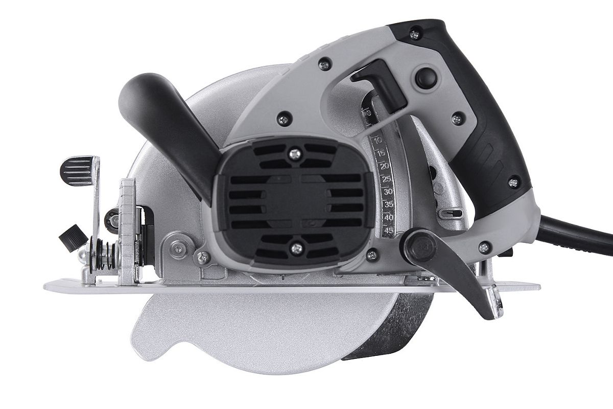 Благодаря специальному рычагу регулируется угол реза. Диапазон регулировки — от 0 до 45 градусов. Твердосплавный пильный диск сделает распиловку более эффективной.