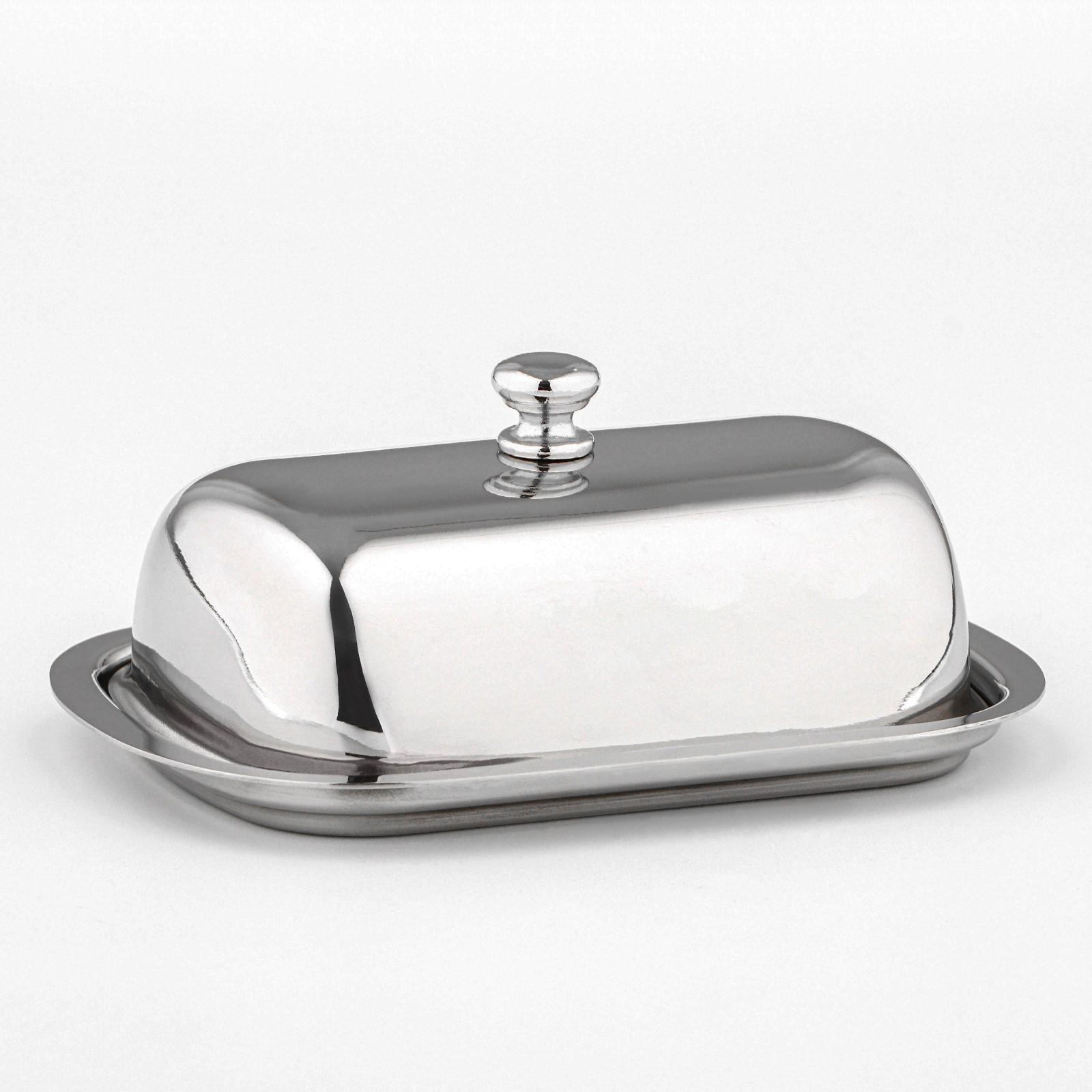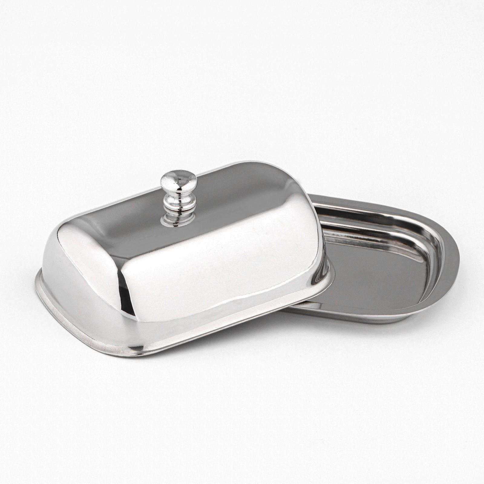 Удобная в использовании масленка может быть использована для хранения сливочного масла или сыра. Масленка с поддоном из коррозионностойкой стали не поддается ржавчине и сохранит продукты свежими, как в холодильнике, так и на обеденном столе. Крышка из стали защитит масло от загрязнений. Прекрасный классический дизайн впишется в любой кухонный интерьер.