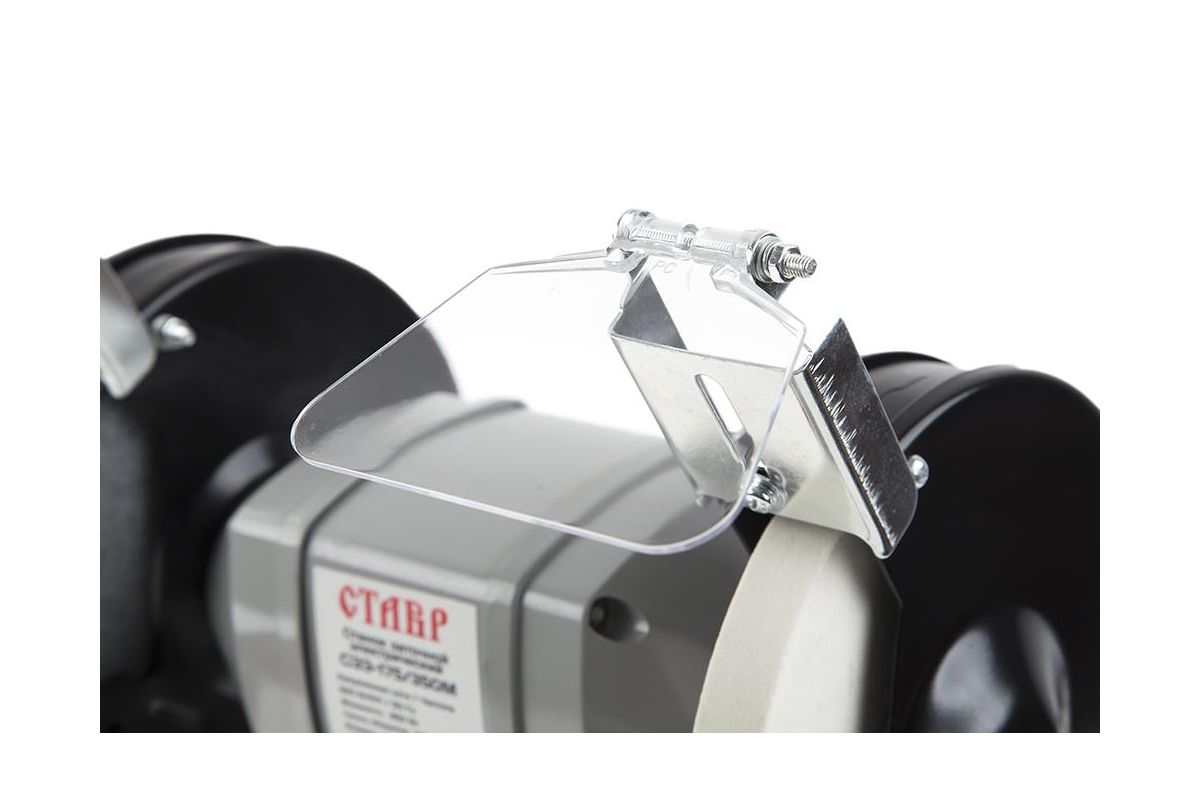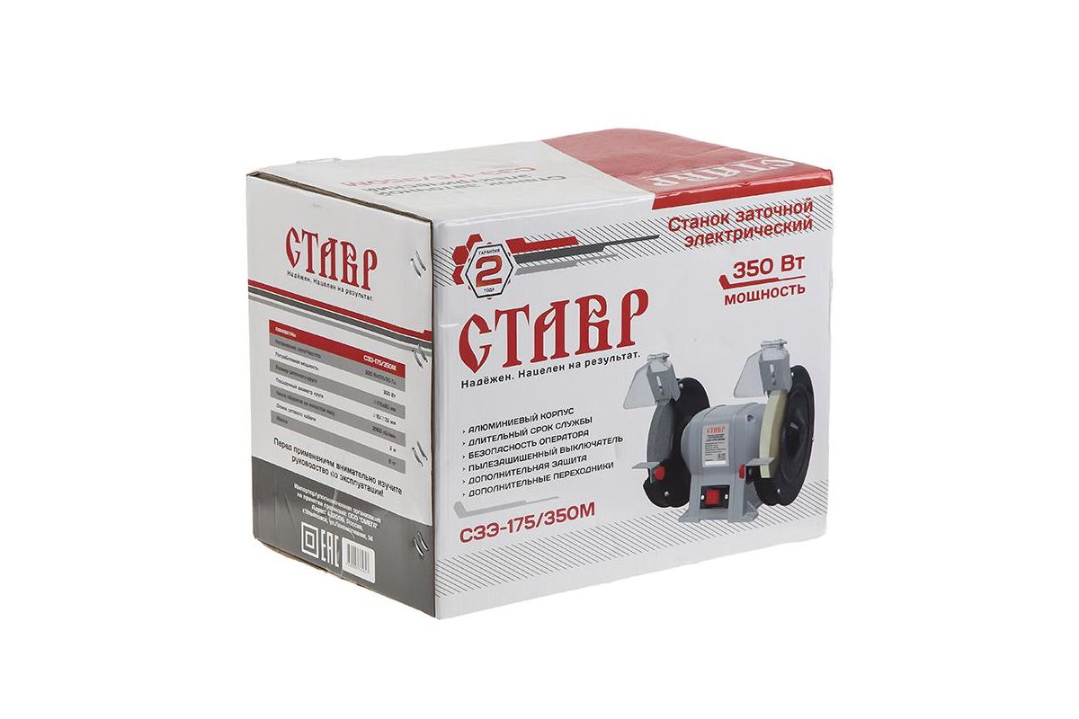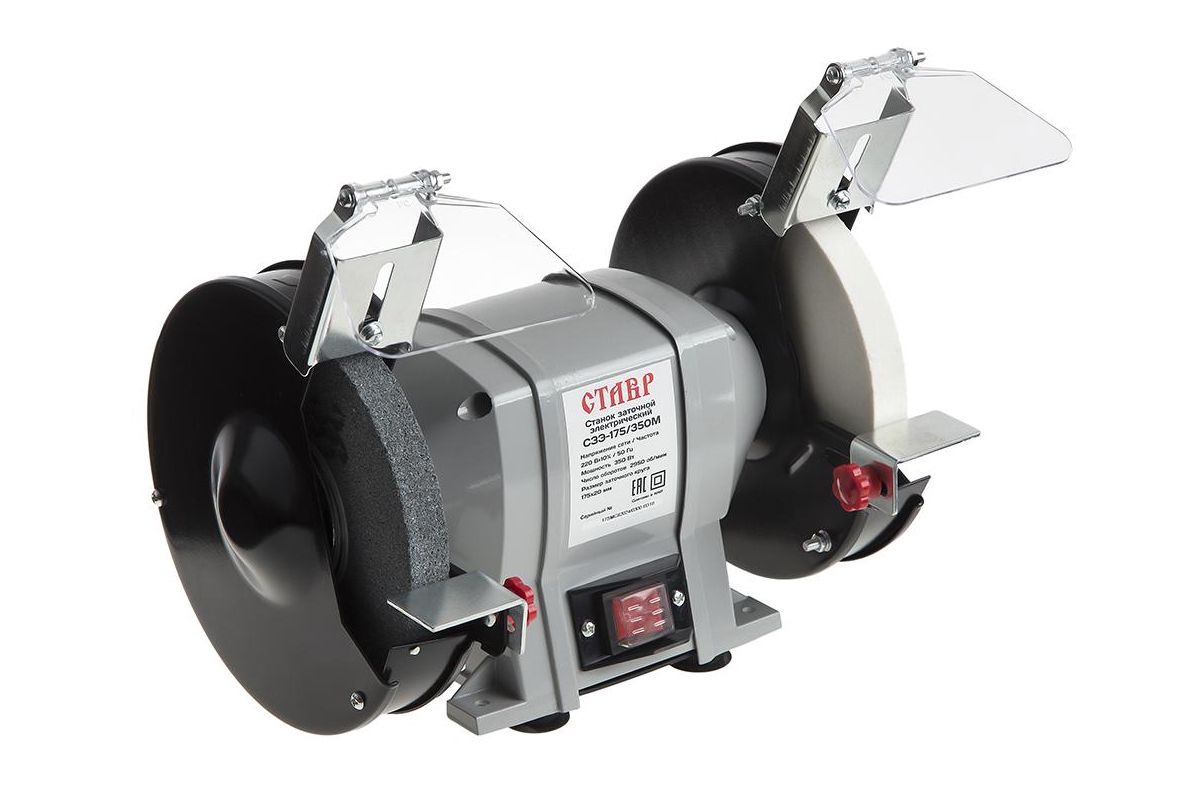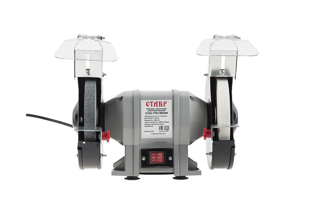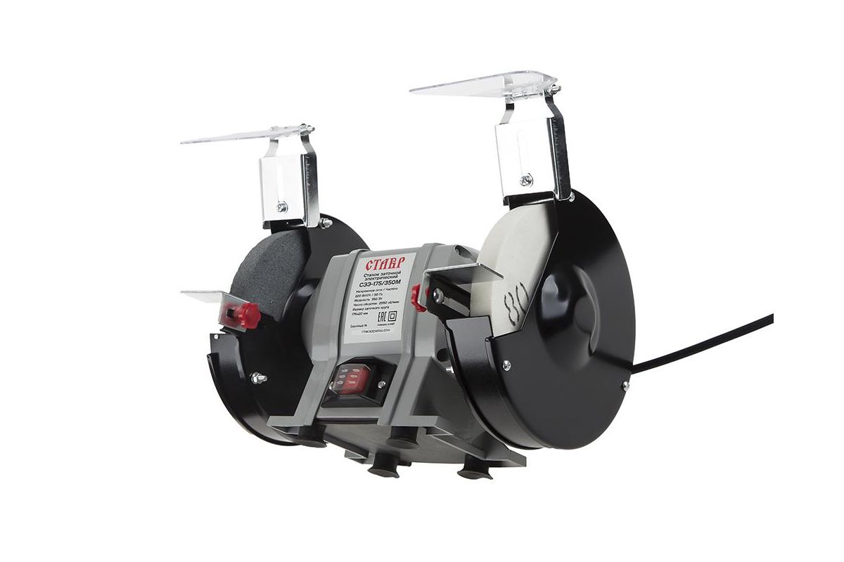СТАВР СЗЭ-175/350 М – заточный станок для шлифовки и заточки изделий из металла и других материалов. Рассчитан на работу в домашней мастерской. Оборудован двумя точильными кругами. Благодаря двигателю мощностью 350 Вт они развивают скорость до 2950 об/мин.