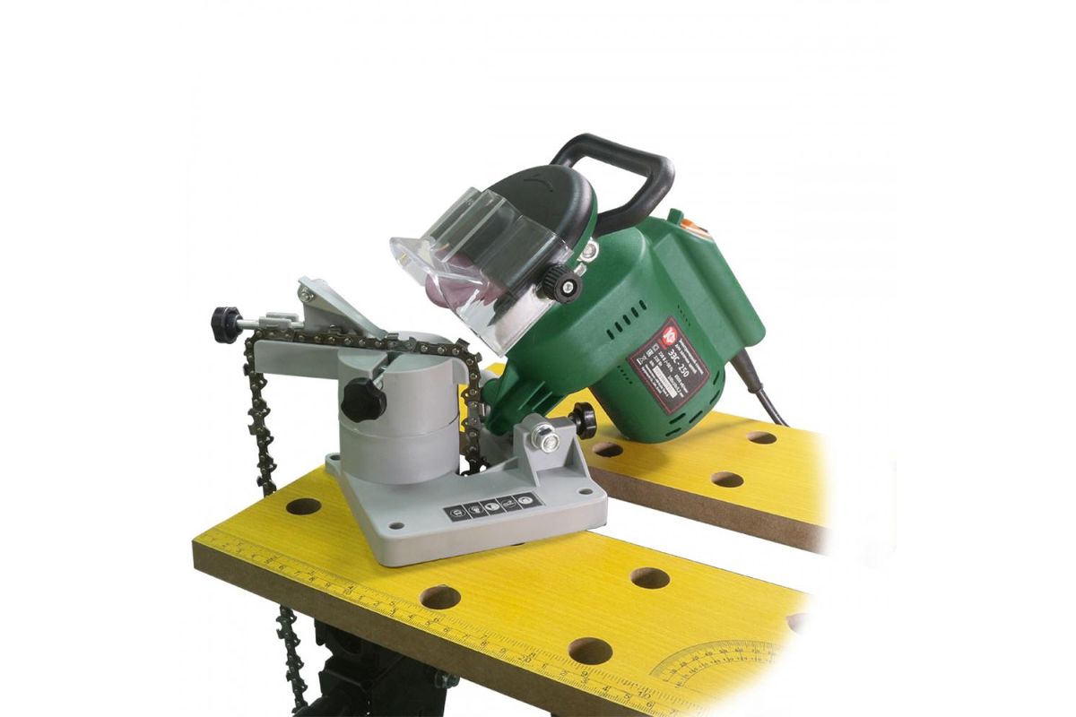Электрический станок для заточки цепей. Предназначен для заточки цепей для цепных электрических и бензиновых пил. В основании имеются монтажные отверстия для крепления станка на рабочем столе (верстаке).