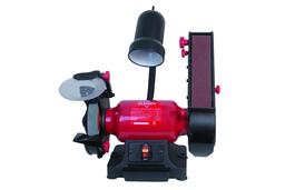 Данный компактный точильный станок работает с заточным кругом (150 миллиметров) и шлифовальной лентой. Мощность — 300 Ватт; частота оборотов — 2850 в минуту. Преимущества: подсветка на гибкой ножке; возможность заточки под разными углами; канавка для заточки сверл; защита от случайного пуска; защитный щиток; пластиковый экран с увеличительным стеклом; съемная ванночка для охлаждающей жидкости, возможность фиксации на верстаке.