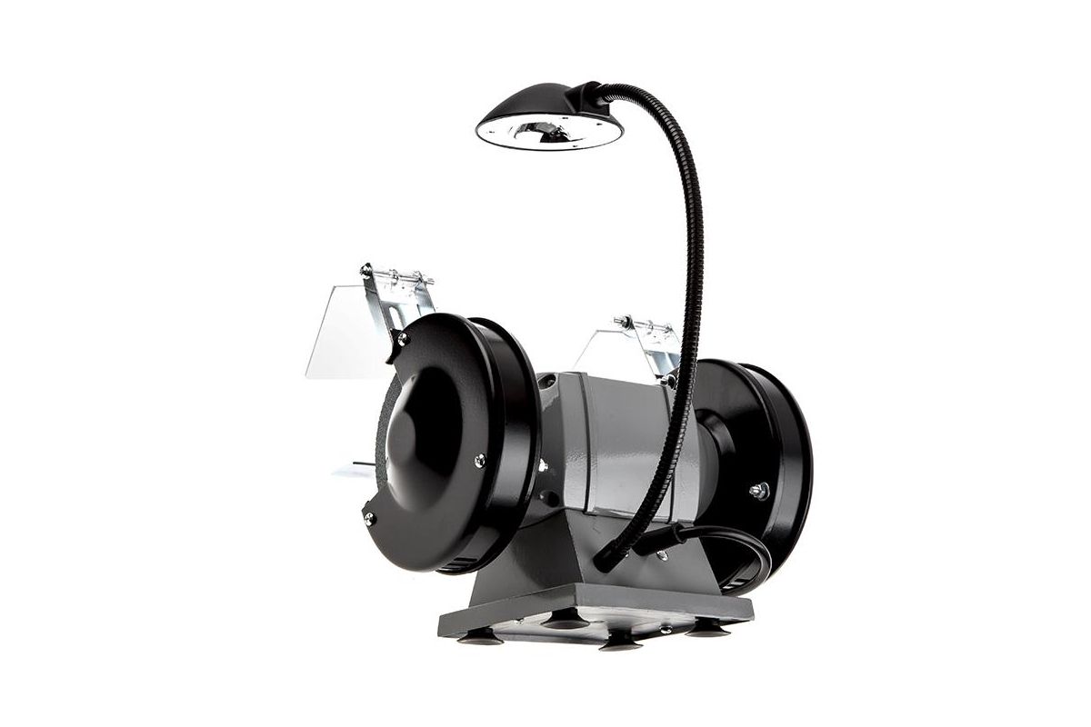 Данный инструмент можно использовать либо в мастерской дома, либо на маленьком производстве. Мощность модели – 120 Ватт; рабочие обороты – 2950/минуту; диаметр абразивного круга – 125 миллиметров. Особенности: встроенная подсветка; защитные пластины; рабочие упоры для размещения детали; пыле- и влагоизолированный выключатель.