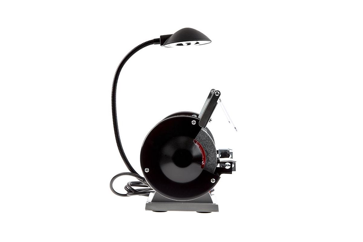 На валу инструмента установлены два рабочих круга различной зернистости диаметром 125 миллиметра. Разные абразивные свойства дисков позволяют проводить грубую заточку либо финальную шлифовку деталей.
