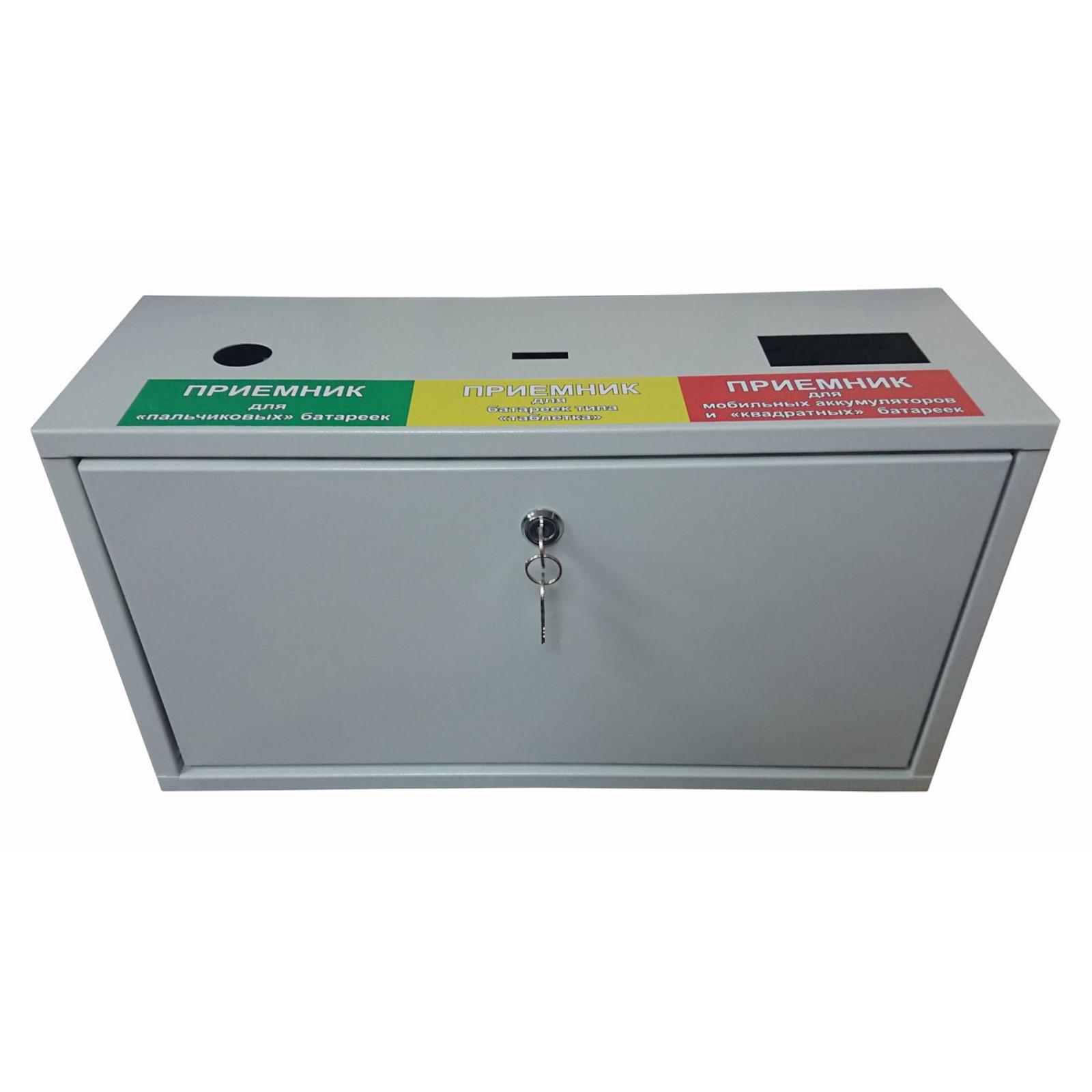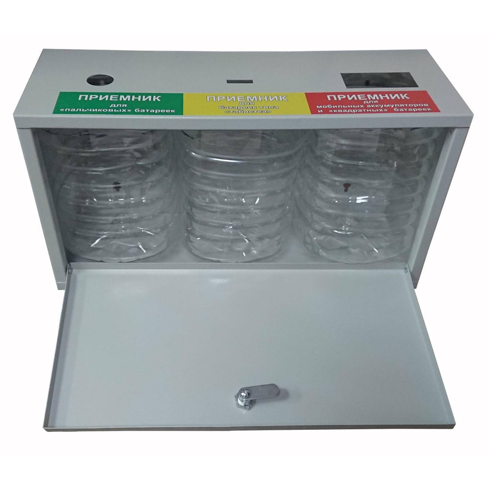 Контейнер для сбора батареек, разделён на 3 секции, металлический