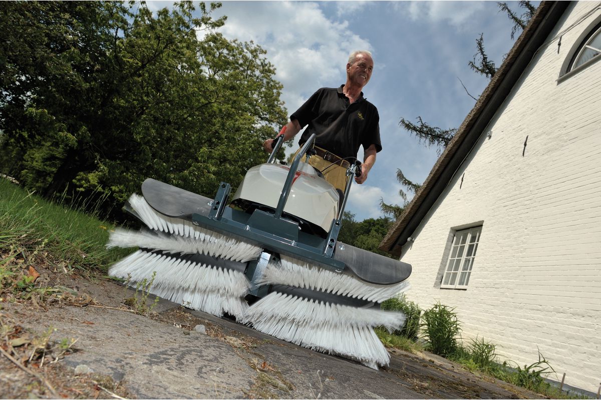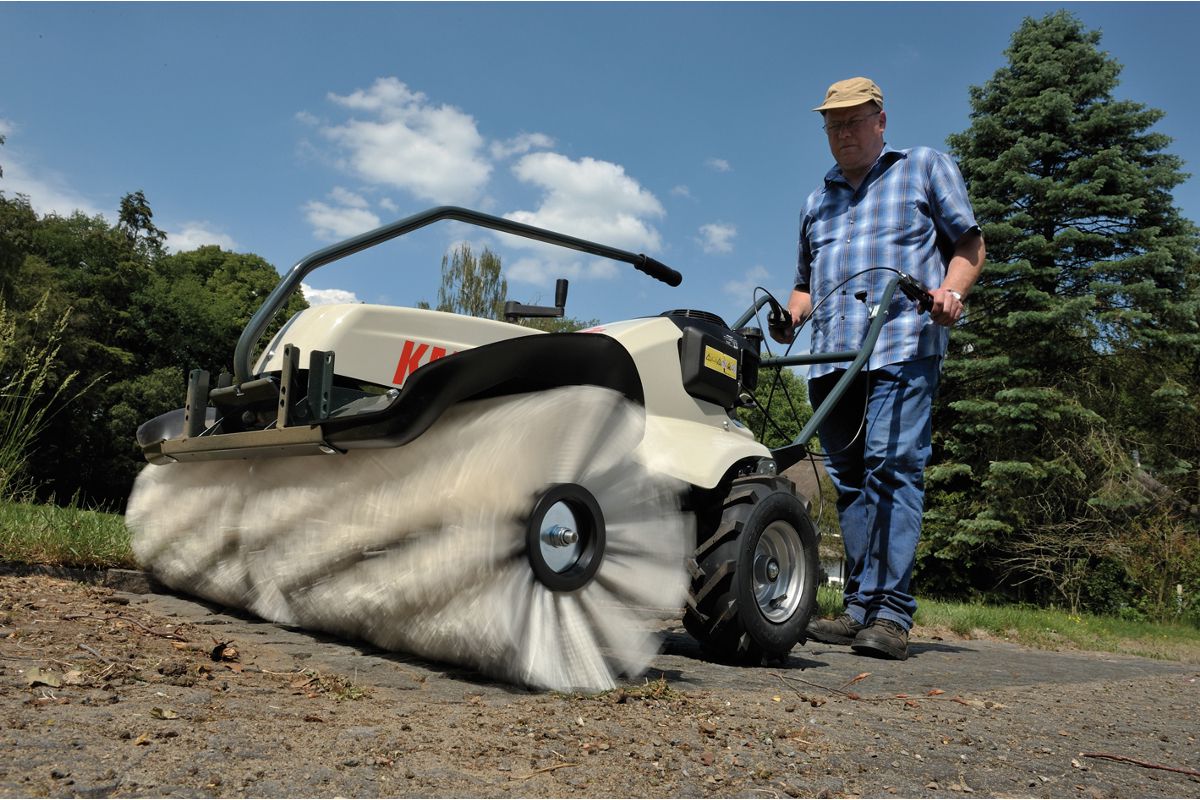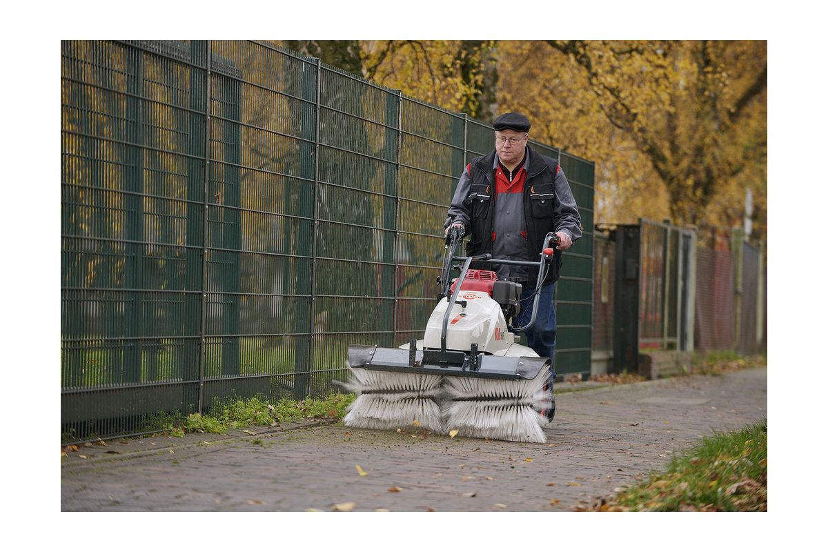 Страна производитель — Германия. Двигатель — Honda GXV340. Номинальная мощность — 9,5 л.с. Максимальная мощность — 11 л.с. Ширина захвата — 100 см. Диаметр щетки — 40 см. Тип трансмиссии — гидростатическая с бесступенчатым переключением передач. Плавная регулировка скорости передвижения и скорости вращения щетки. Отключаемый привод одного из ведущих колёс (разблокировка дифференциала). Скорость передвижения: вперед от 0 до 5,1 км/ч, назад 0-3 км/ч. Круиз-контроль. Нулевой радиус разворота. Бесступенчатая регулировка высоты щетки над поверхностью. 3-х слойное лакокрасочное покрытие корпуса. Рукоятки регулируются по высоте. Щетка поворачивается в одно из 5-ти положений. Размер колес: 16х6,50-8. Габариты: 194/100/93 см. Вес: 156 кг. Гарантия — 2 года.