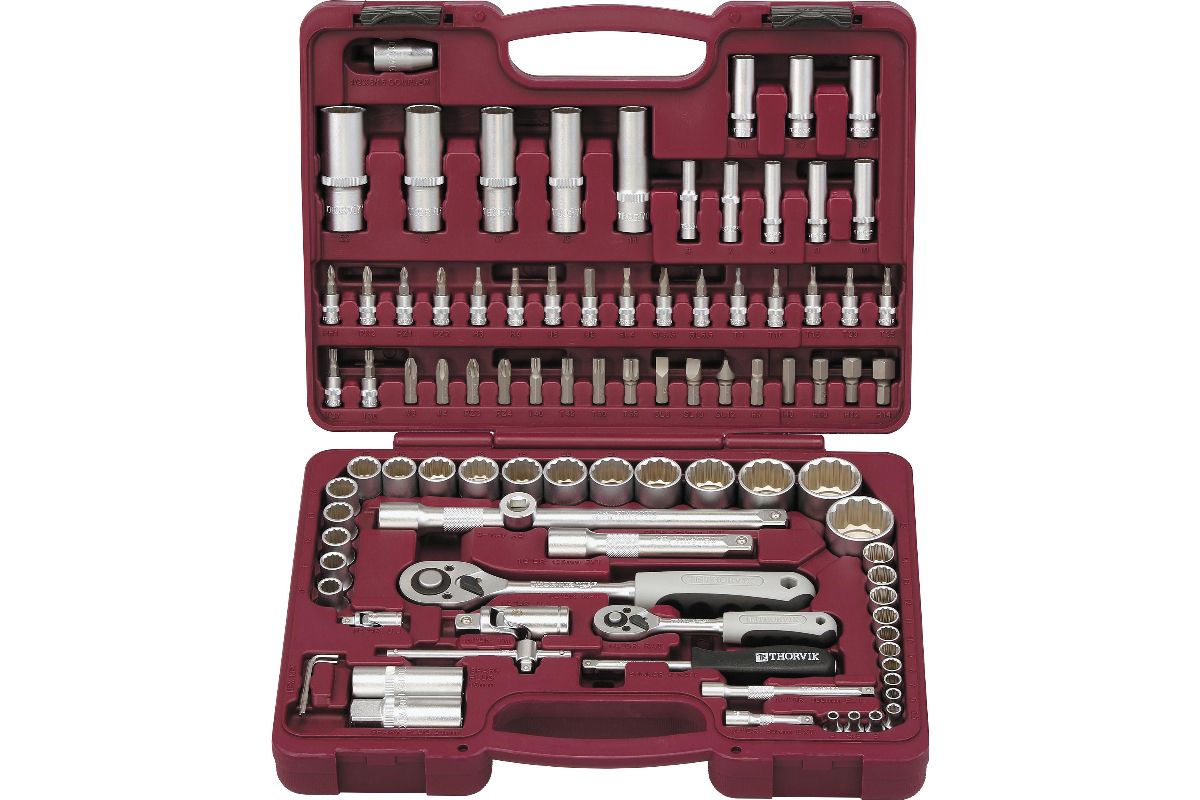 Универсальный набор инструмента 1/4, 1/2DR THORVIK UTS0094/12 52807 включает в себя большое количество инструмента для работы с разнообразными типоразмерами крепежа. Комплект поставляется в прочном пластиковом кейсе. Удобное расположение элементов набора