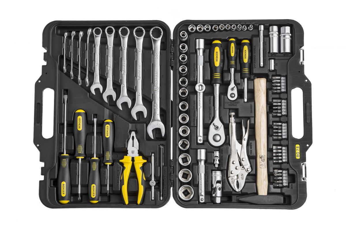 BERGER BG078-1214 – универсальный комплект инструментов. Подходит для широкого спектра сервисных, ремонтных и монтажных работ. Поставляется в эргономичном кейсе с широкой ручкой и металлическими защёлками. Все металлические элементы изготовлены из прочной легированной стали, стойкой к коррозии.