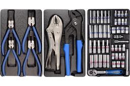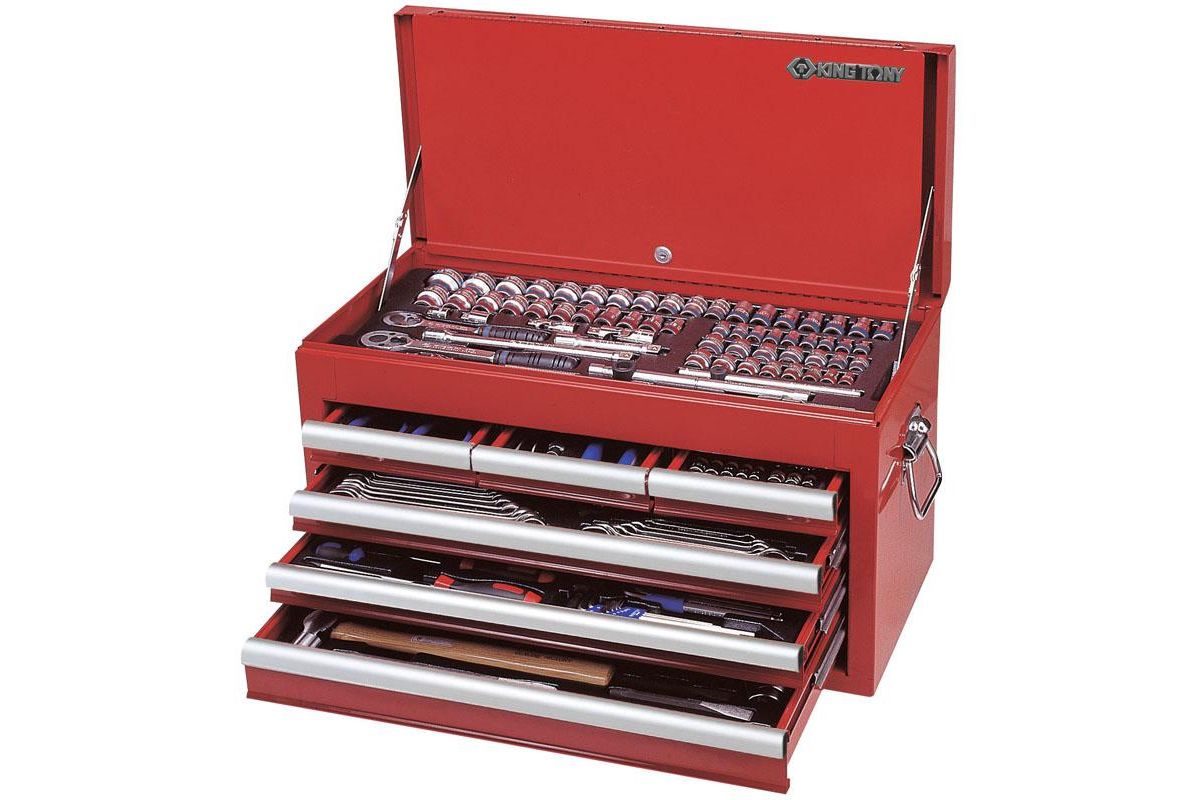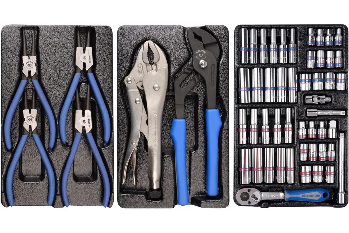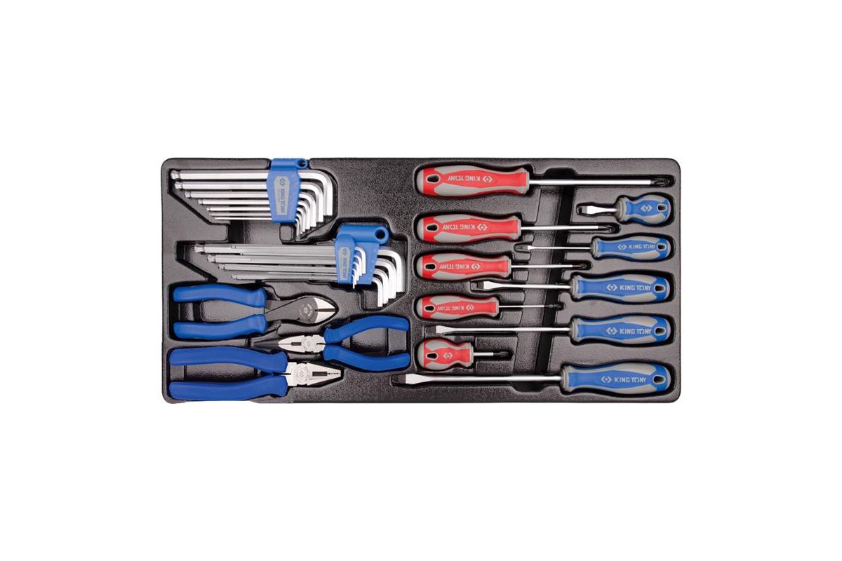 Набор инструментов марки KING TONY состоит из 219 предметов, и включает в себя ложементы, размещённые в инструментальном ящике. Каждый ложемент расположен на своей полке, что позволяет содержать инструмент в полном порядке. Комплектация набора включает в