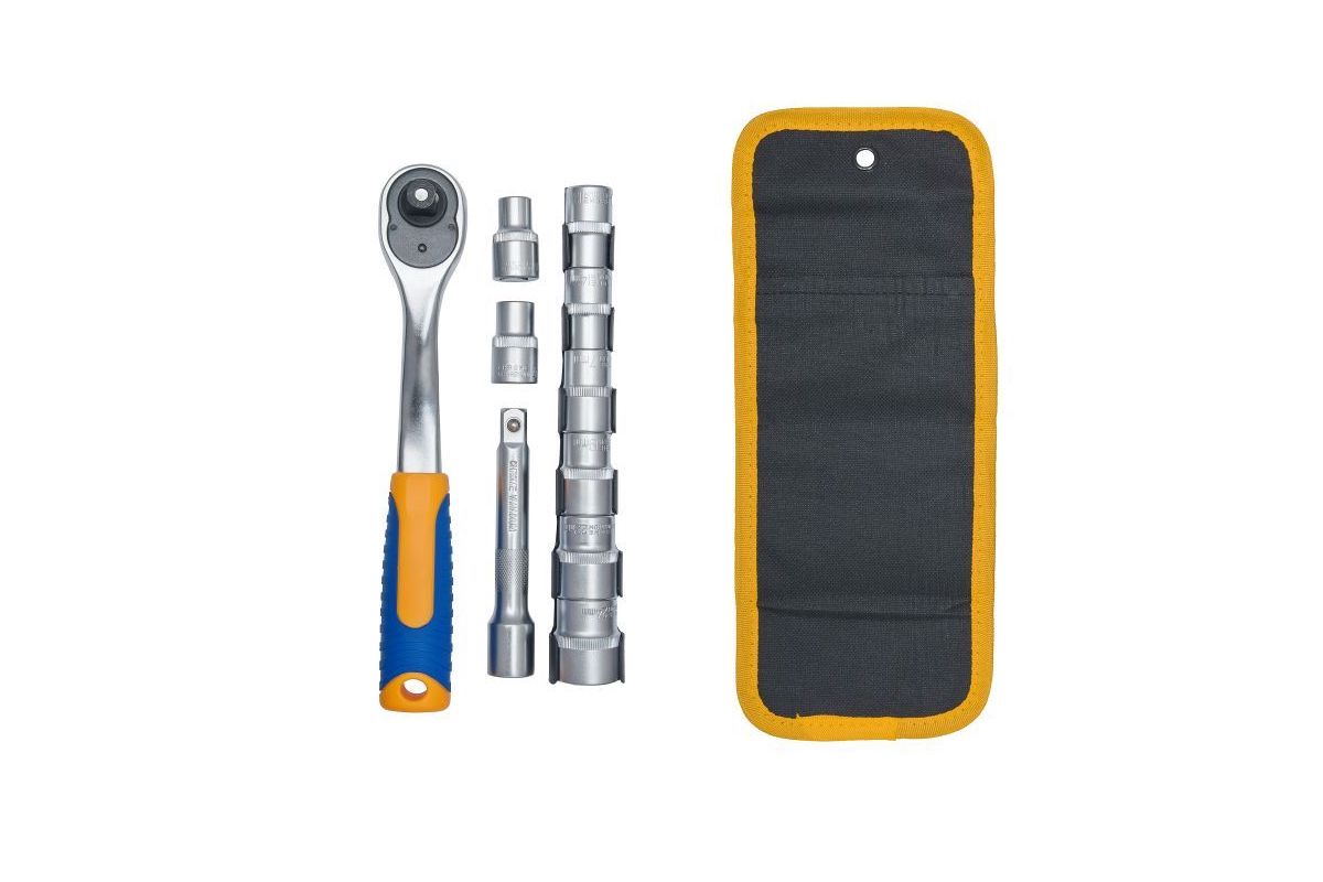 Состав набора: - Торцевые головки ?''Dr 6 граней (8шт.):10;12;13;14;17;19;22;24мм - Удлинитель ?'' (1шт.):127mm; - Рукоятка трещоточная ?'' 250mm (72 зубца, ремонтопригодная, двухкомпонентная)