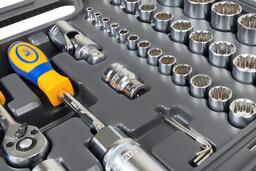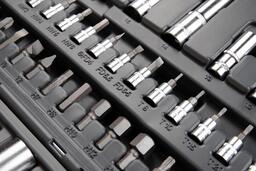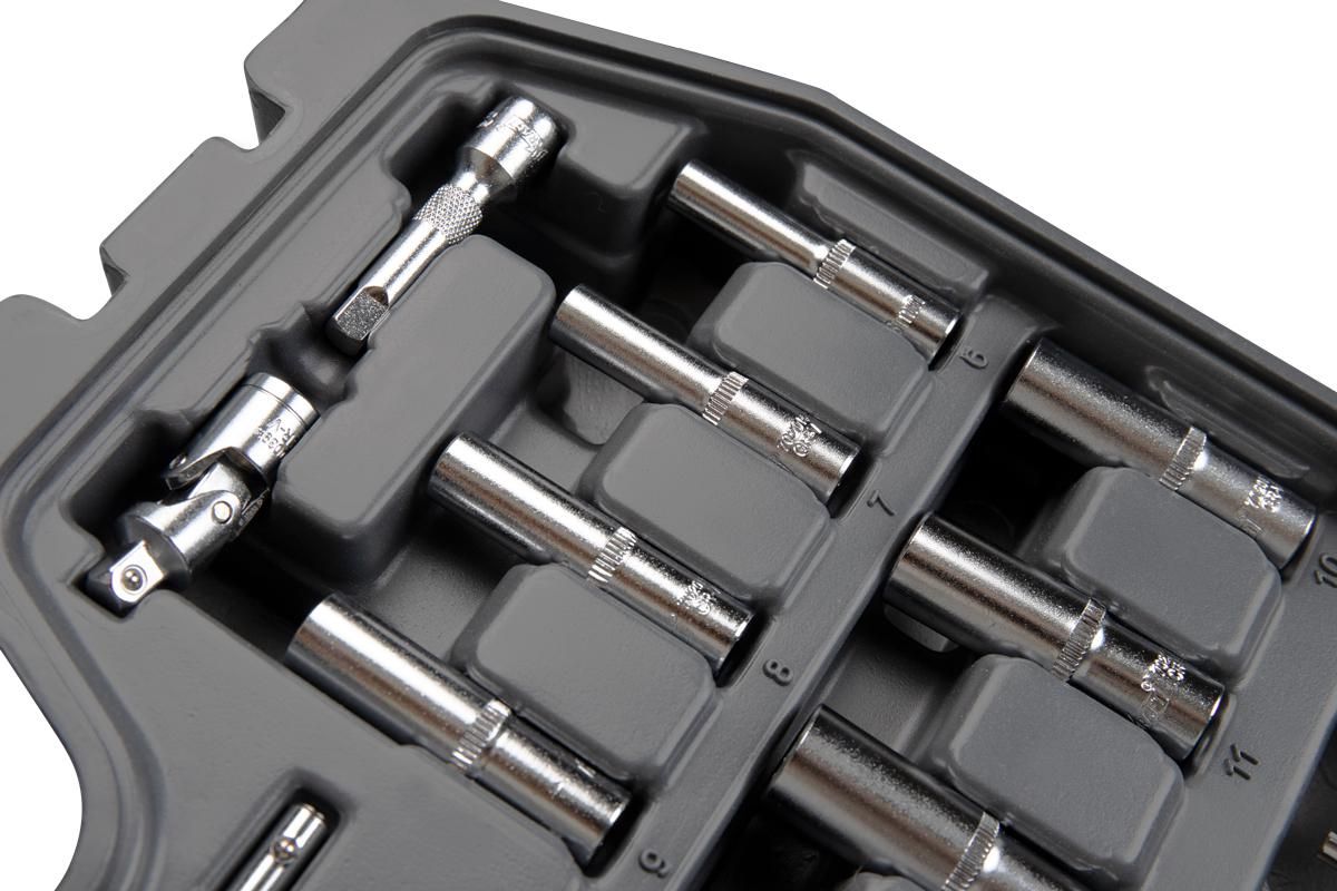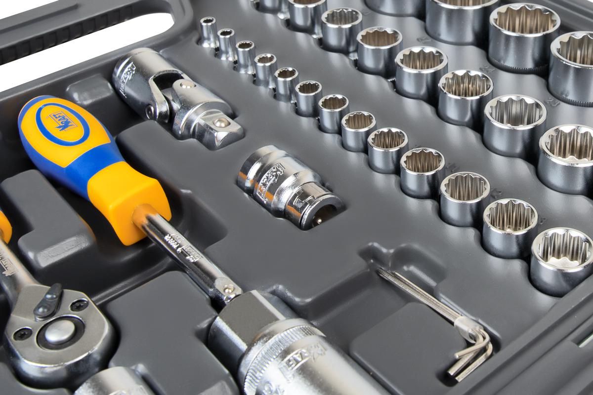 Набор инструмента 94 предмета с торцевыми головками с 12-гранным рабочим профилем базовой комплектации, позволяет производить обслуживание резьбовых соединений в широком диапазоне размеров 4-32 мм, полнофункциональный набор торцевых головок и принадлежно