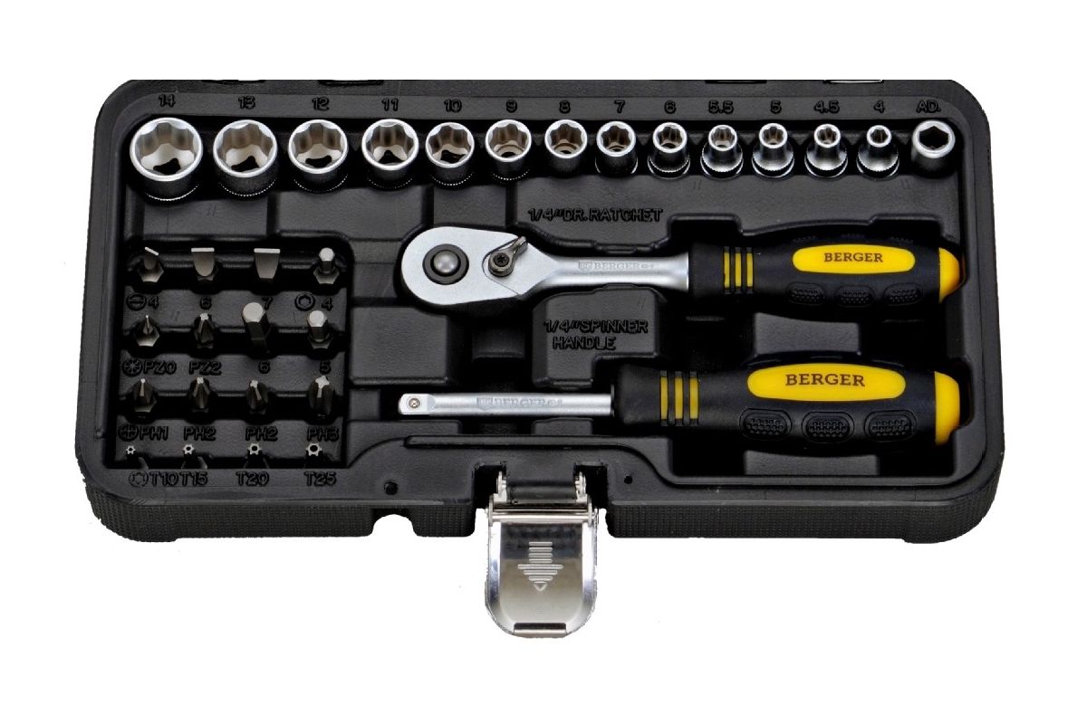 BERGER BG043-14 – универсальный набор авторемонтного инструмента для профессионального использования. В наборе 43 предмета. Технологии гальванизации и закаливания обеспечивают высокий уровень износоустойчивости и прочности инструментов. Набор поставляется в ударопрочном пластиковом кейсе. Вес– 1,13 кг.