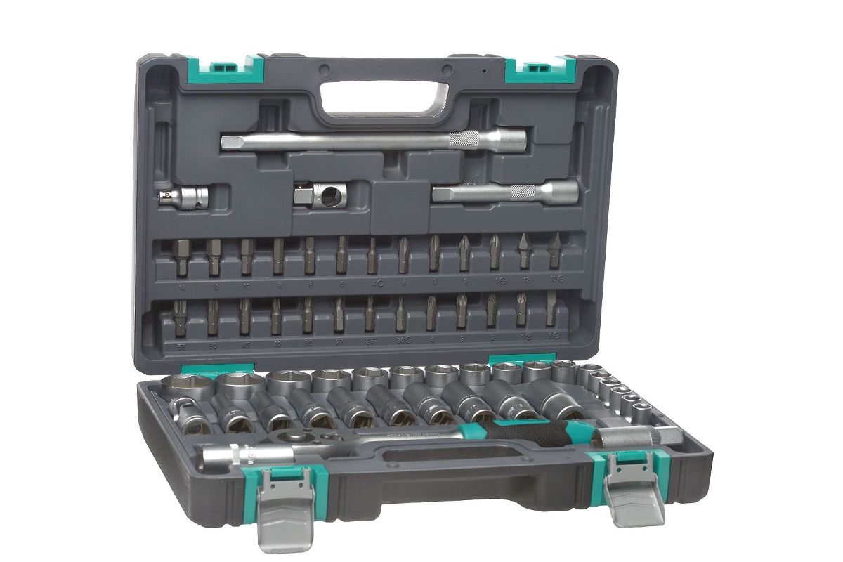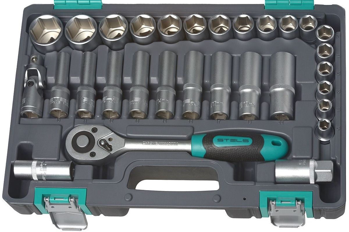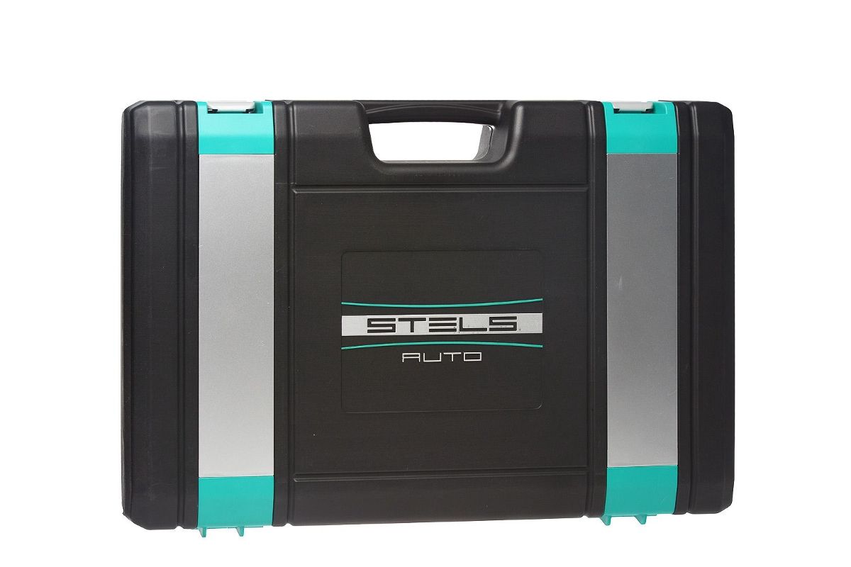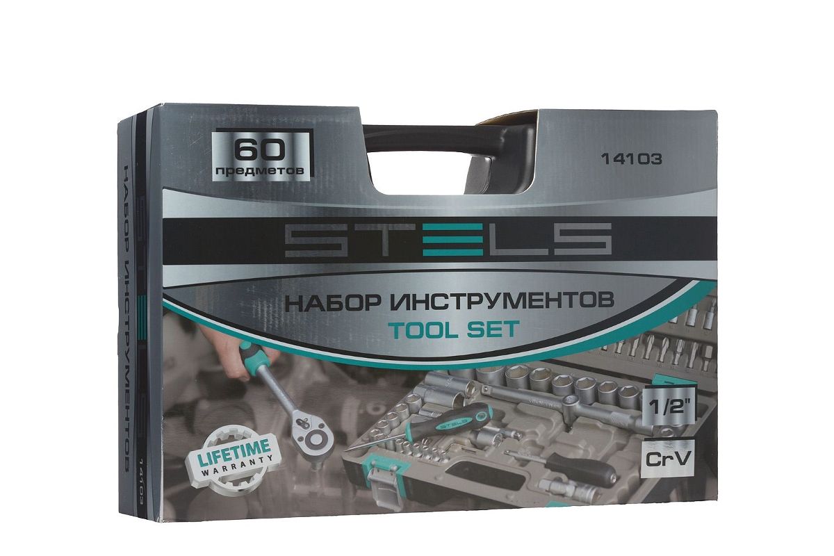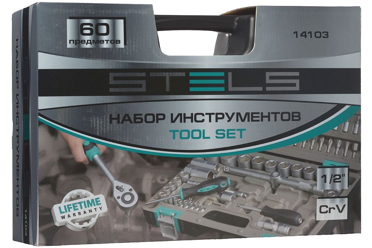 STELS 14103 — набор инструментов на 60 предметов для бытового и автомобильного ремонта. Позволяет работать с любыми гайками. Основу набора образуют отверточные биты и торцевые головки 1/2". Трещотка с удобной прорезиненной ручкой изготовлена из качественной износостойкой стали. Принадлежности компактно складываются в кейс с крепкими защелками. Общий вес — всего 5 кг.