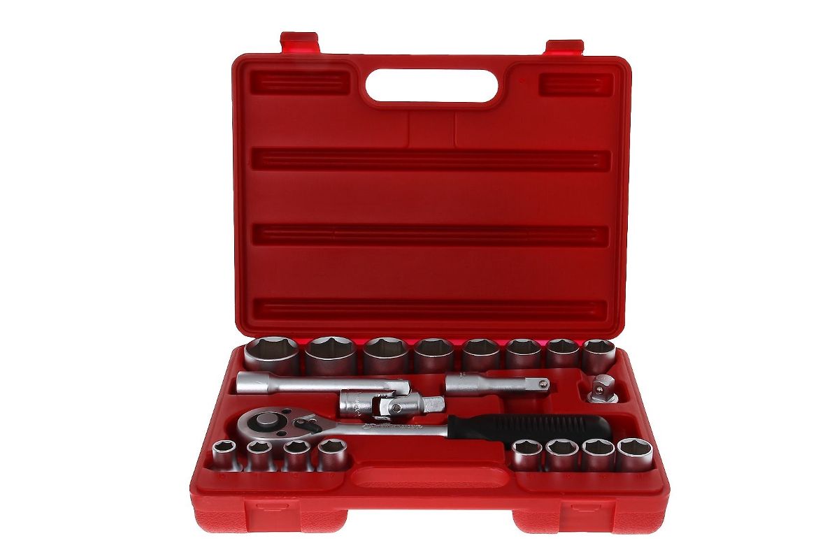 В набор входят инструменты под квадрат 1 2: ключ трещоточный (45 зубьев) с эргономичной 2-цветной ручкой, реверсом и механизмом разблокировки шарикового фиксатора, головки торцевые 6-гранные – 16 шт. (10, 11, 12, 13, 14, 15, 16, 17, 18, 19, 21, 22, 24, 27