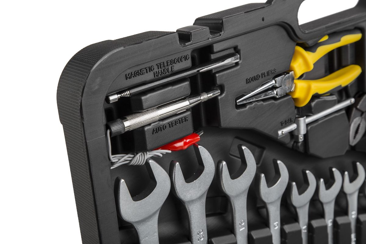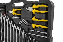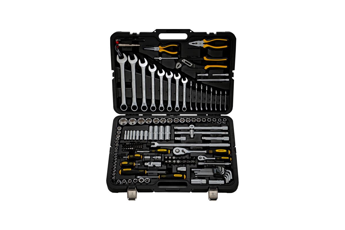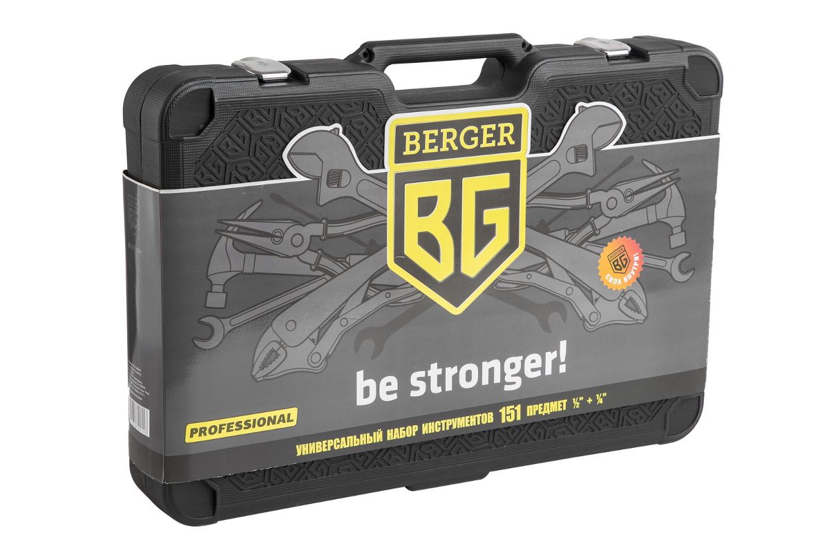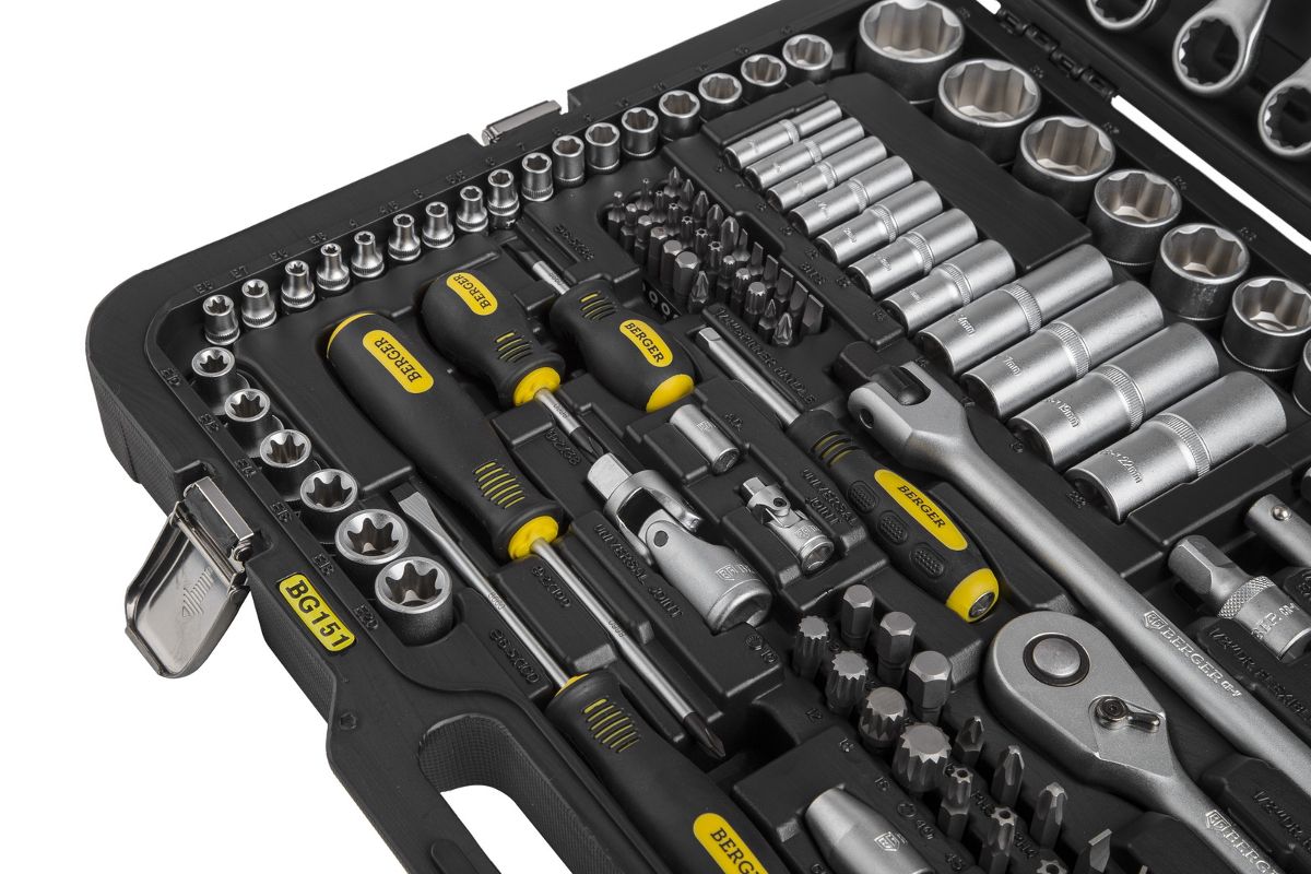 BERGER BG151-1214 – набор инструментов для авторемонта, обслуживания трубопроводных систем, слесарных, монтажных и прочих ремонтно-строительных работ. Всего 151 предмет. В составе набора: торцевые головки, трещотки, гаечные и шестигранные ключи, отвертки, биты с посадкой 1/4 и 5/16". Размеры кейса: 57 x 39,2 x 9,5 см.