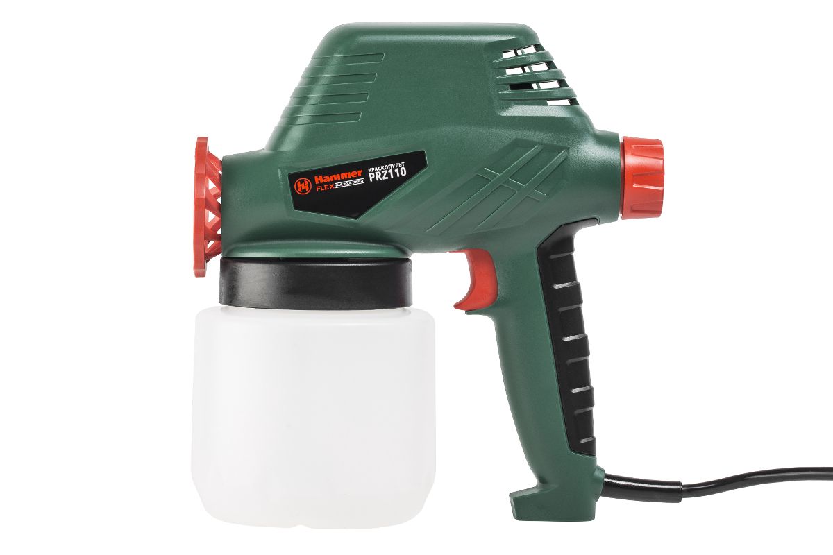HAMMER PRZ110 – электрический краскопульт для распыления краски, дезинфицирующих средств, пестицидов или пропиток на различные материалы. Мощность 110 Вт. Пригодится для использования дома или в мастерской.