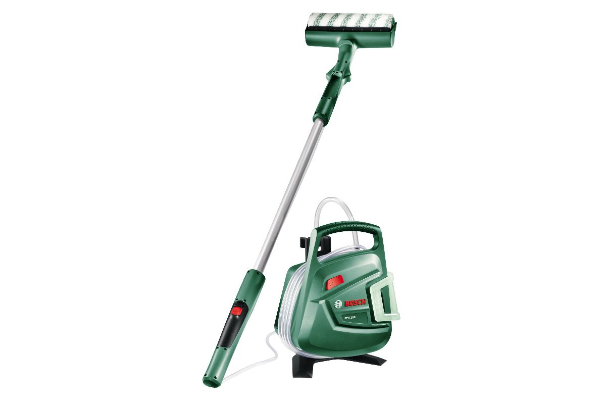 Краскопульт BOSCH PPR 250 хорошо и быстро прокрашивает углы, труднодоступные места и структурированные поверхности. Удлиняющую рукоятку можно снять, чтобы более эффективно окрашивать небольшие участки. Кстати, к этому краскопульту конструктивно подходят валики других брендов. А в качестве спецпринадлежности можно докупить пистолет-распылитель для нанесения лака и лазури.