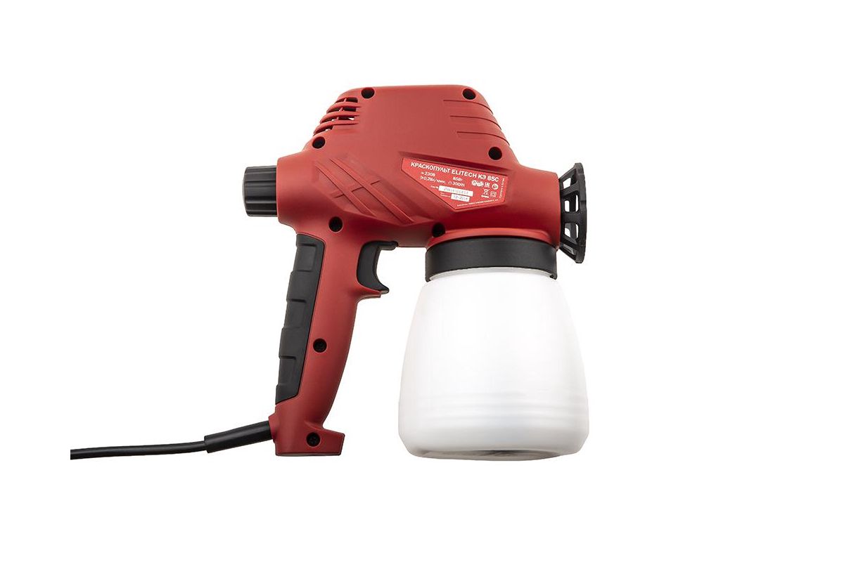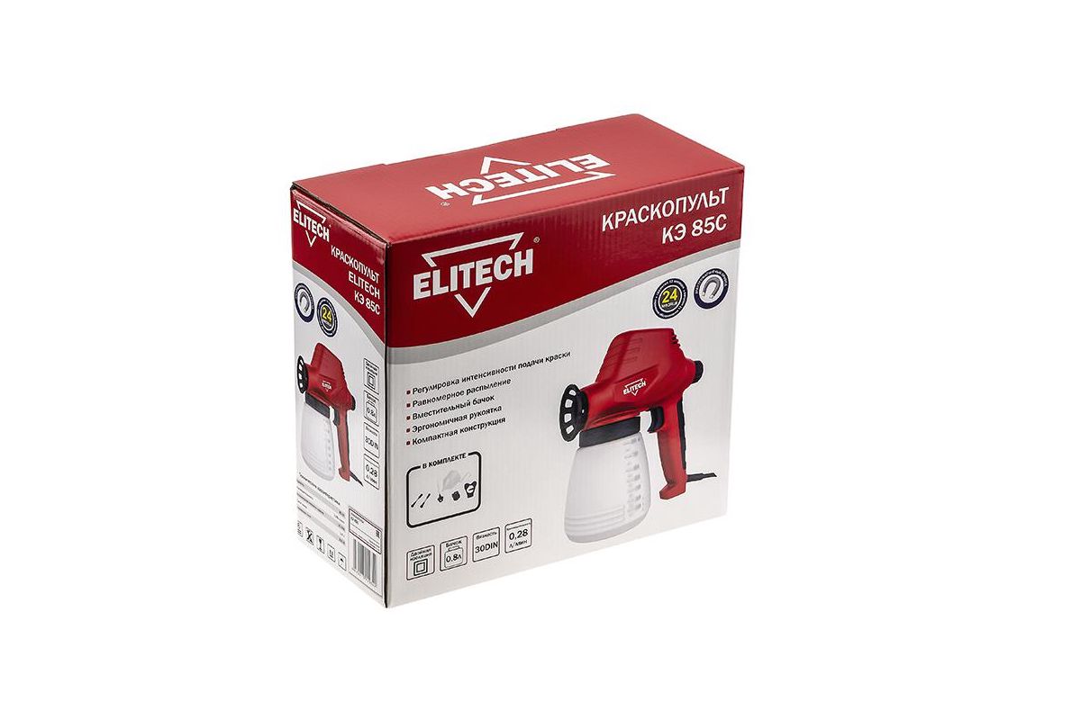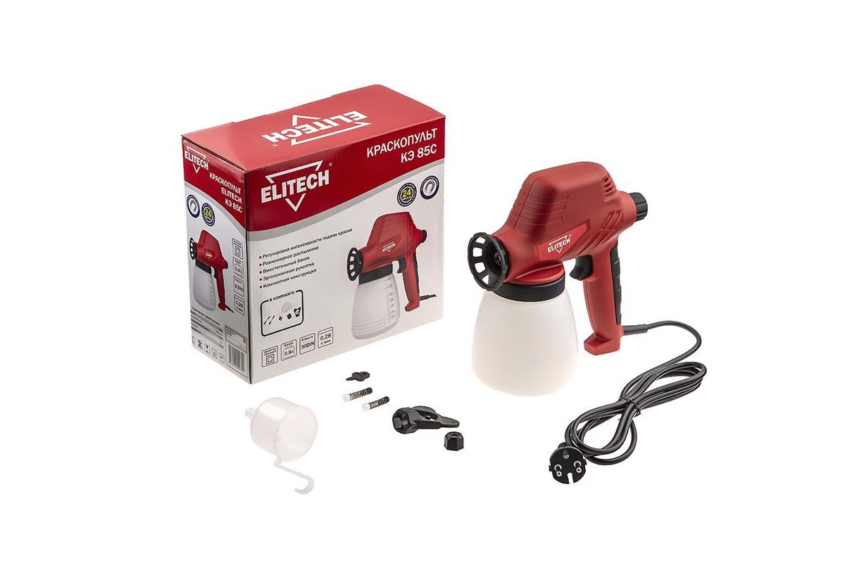 ELITECH КЭ85С – электрический воздушный краскораспылитель. Мощность 85 Вт, производительность 0,28 л/мин. Ёмкость бака 0,8 л. Подходит для распыления материалов с вязкостью до 30 DIN: краски, пропитки, лаки, антисептики и т.д.