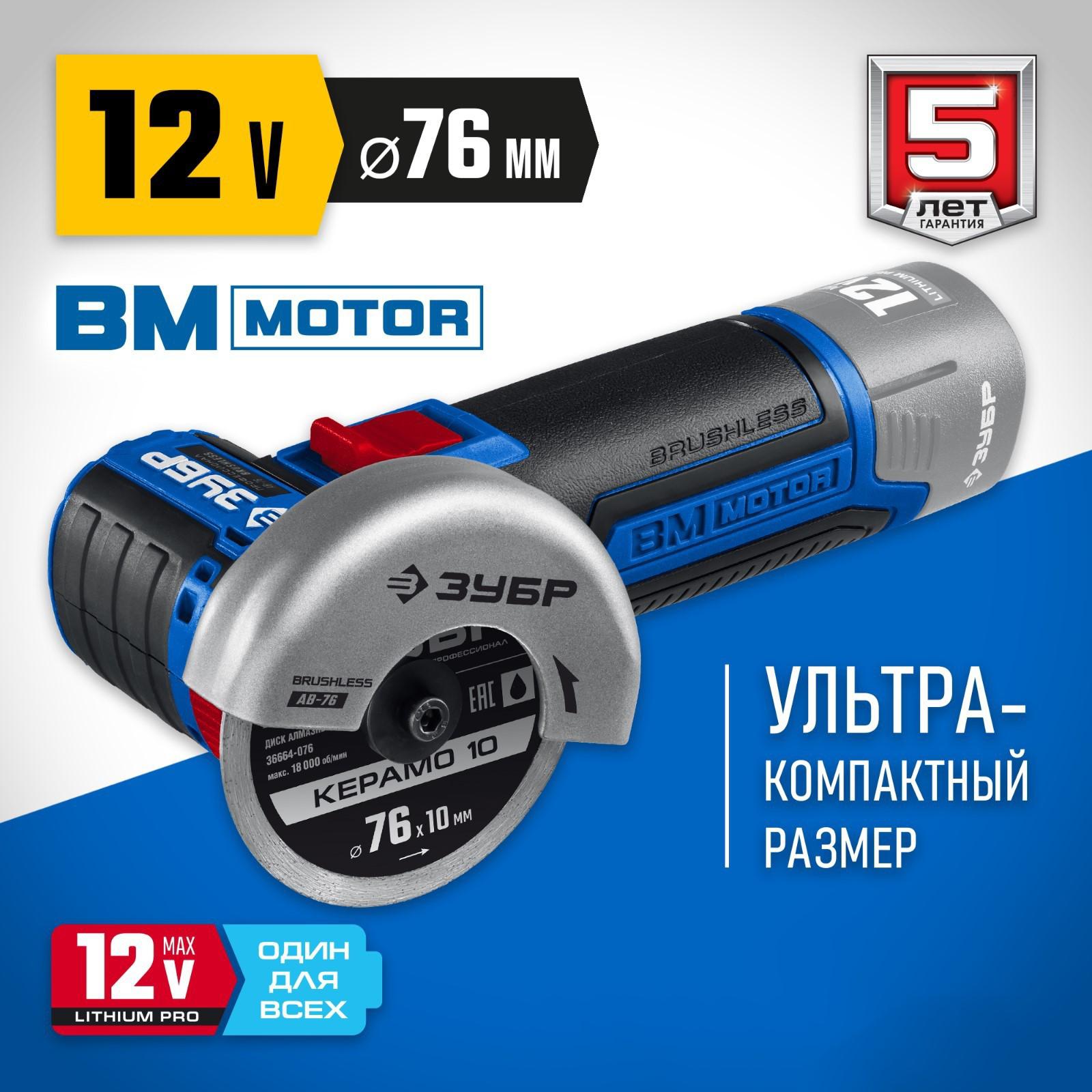 УШМ ЗУБР AB-76, бесщеточная УШМ, без АКБ, в коробке, 12В