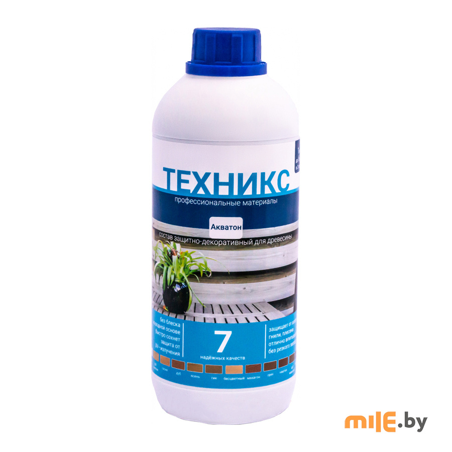 Пропитка Техникс Акватон предназначена для защиты неокрашенных изделий из древесины (оконные рамы, двери и др.), деревянных конструкций (балок, лаг, столбов, заборов) и других пиленных, строганных и клееных элементов конструкций от воздействия атмосферных осадков, плесневых и деревоокрашивающих грибов. Состав «Акватон» применяется также для декоративной отделки под ценные породы древесины, сохраняя естественную структуру древесины. Представляет собой смесь специальных функциональных добавок в акриловой дисперсии, проникающую в древесину на глубину 2–3 мм, формируя активный барьер развитию микроорганизмов. Нетоксичен, практически не имеет запаха.